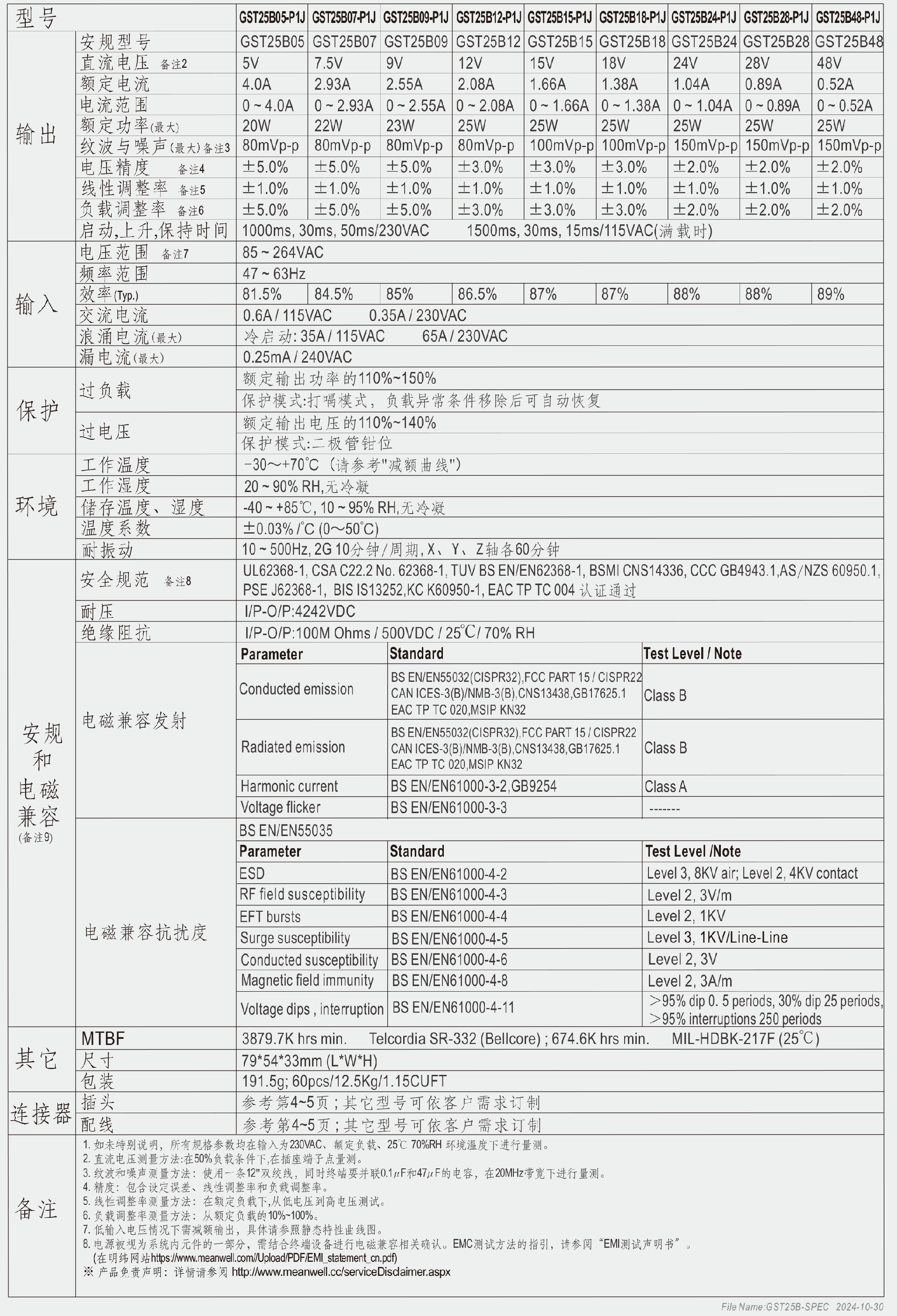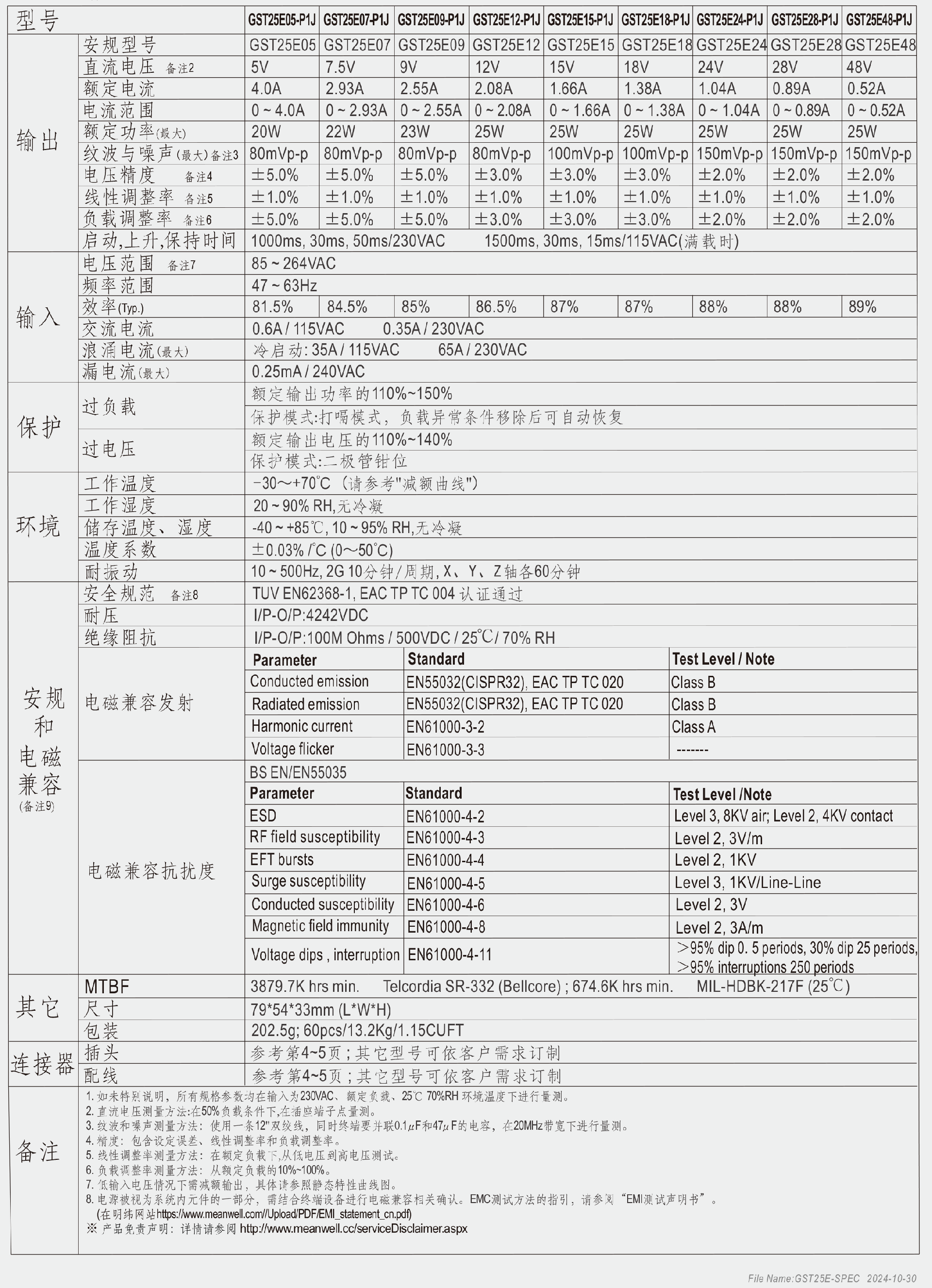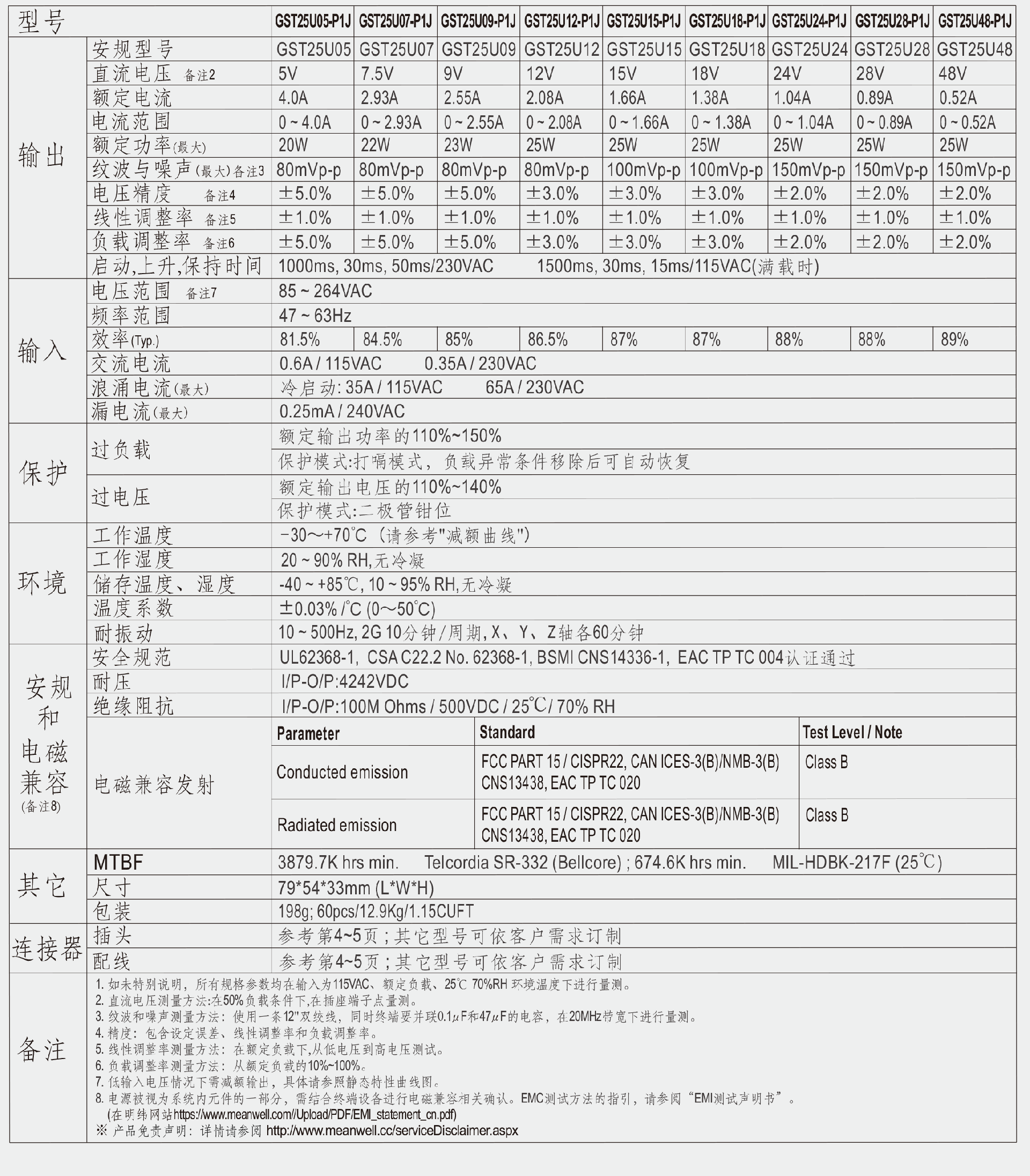 .GST25A:3极交流IEC320-C14输入接口,ClassⅠ电源;GST25B:2极交流IEC320-C8输入接口,Class Ⅱ电源;GST25E:2极欧式插头,Class Ⅱ 电源;GST24U:2极美式插头,Class Ⅱ 电源