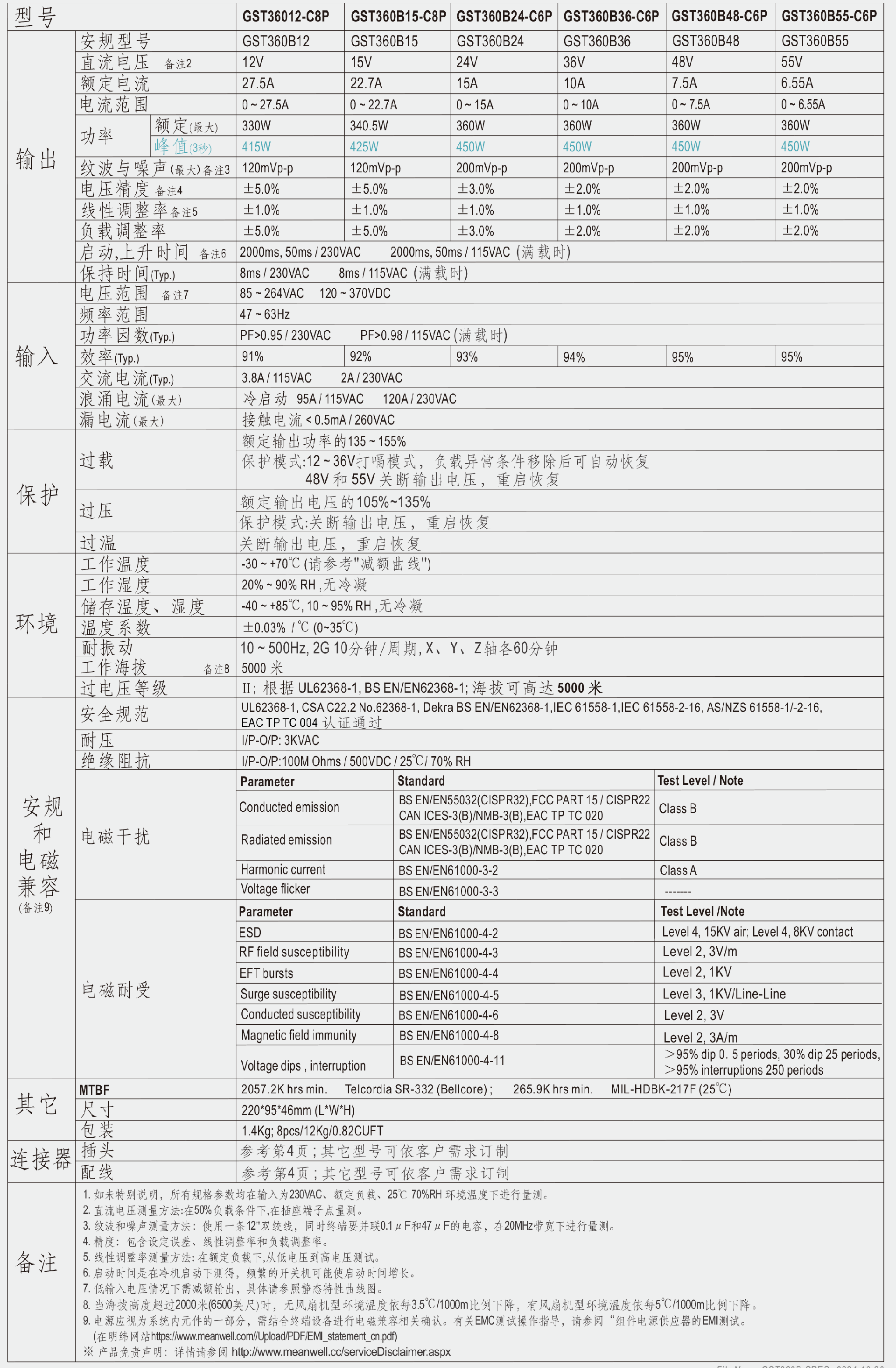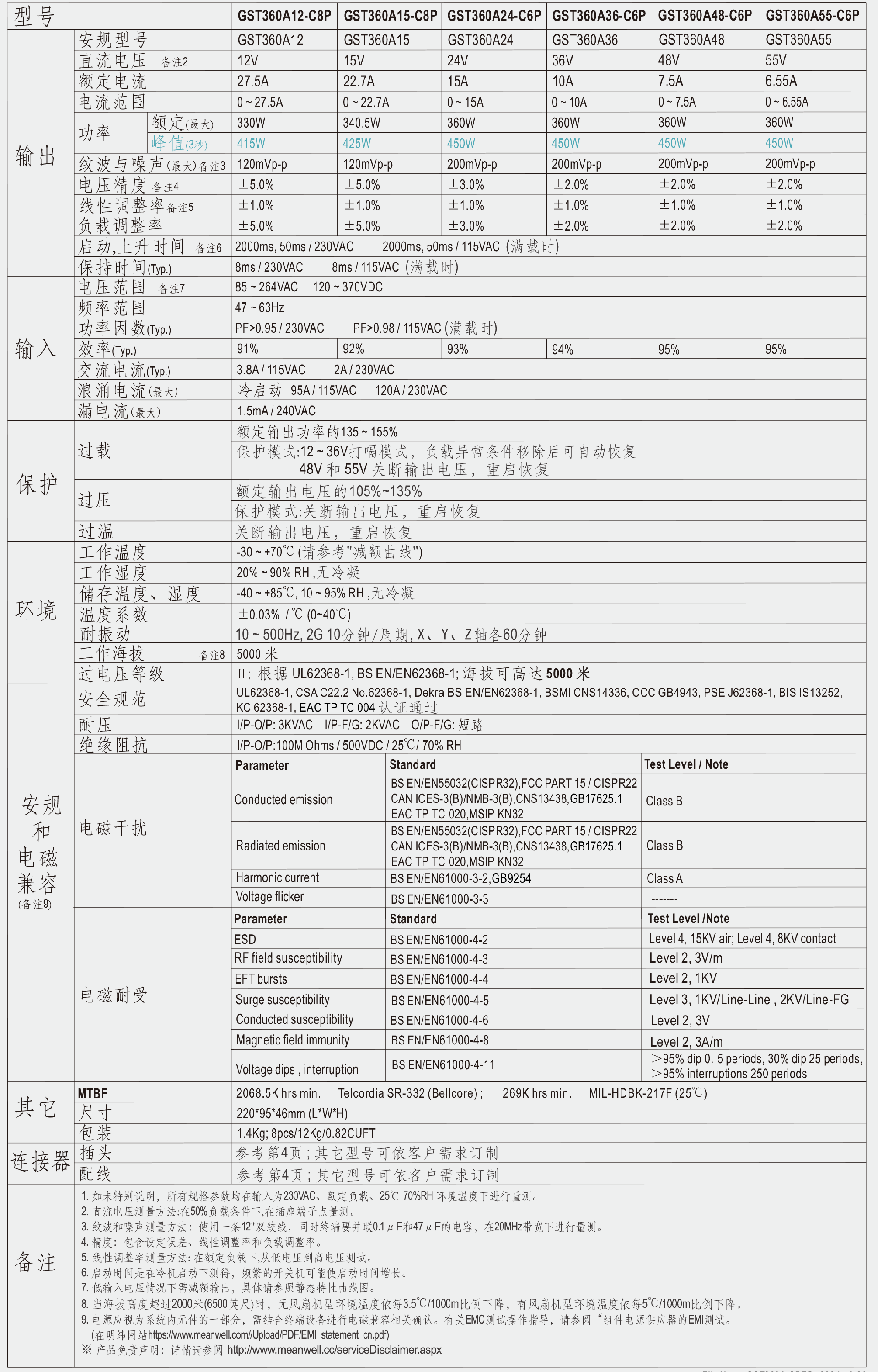 GST360A,GST360B系列是一款高信赖性,360W桌面型单组输出绿色环保适配器,GST360A是classI电源(有FG接地),配备IEC320-C14标准AC接口;GST360B是classI电源(无FG接地)配备IEC320-C18标准AC接口,适合输入电压85VAC~264VAC应用,整系列提供输出电压为12VDC至55VDC的不同型号,可满足各种消费类电子设备的需求。