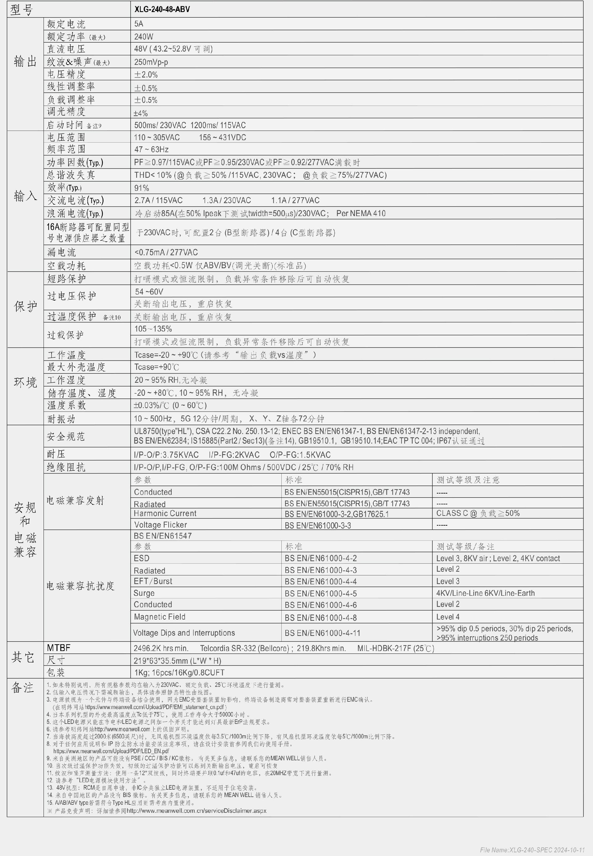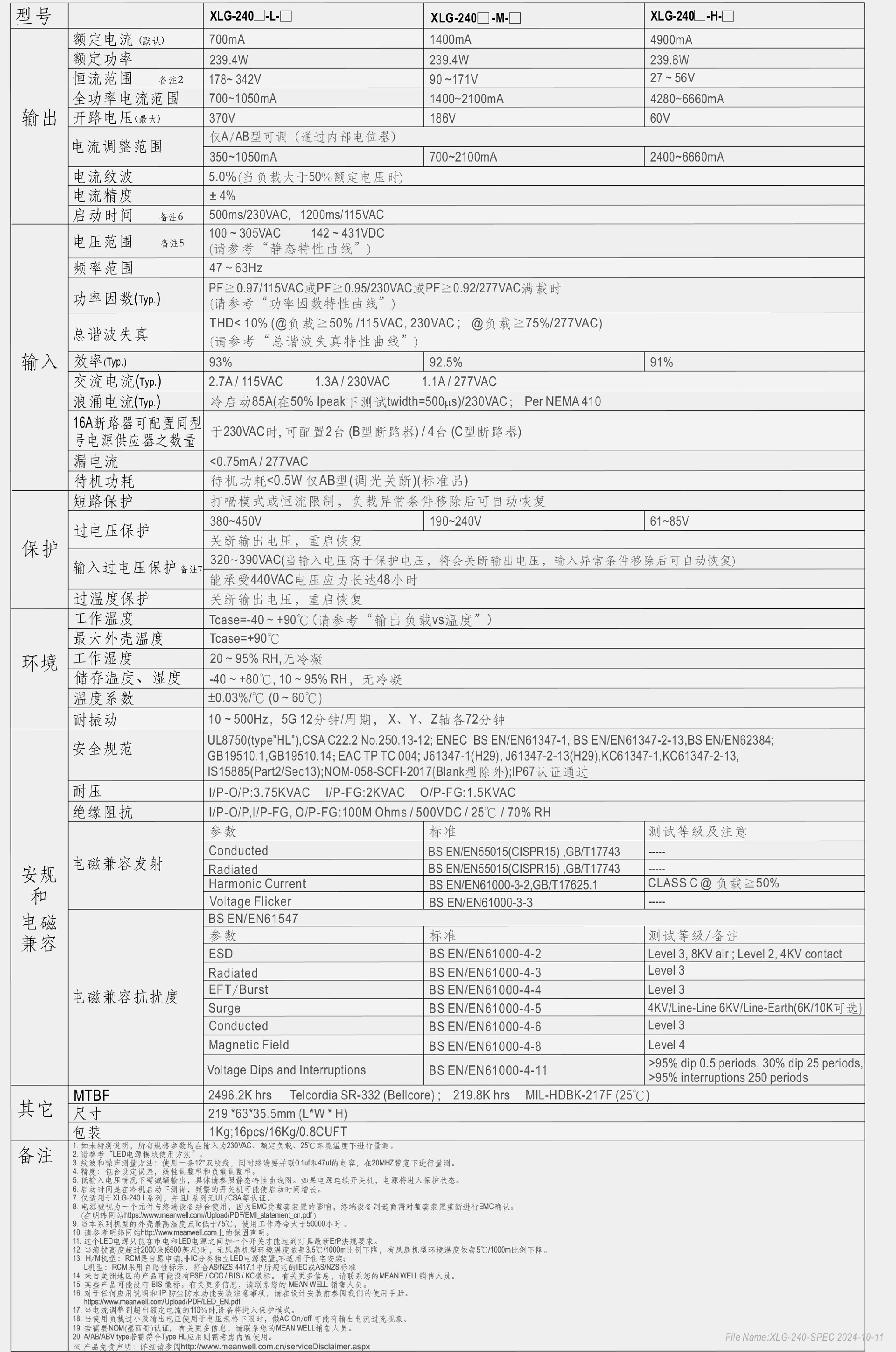 XLG-240系列是一款240W交流变直流LED电源供应器,以恒功率模式为特点。此系列机型可工作在输入电压为100-305VAC,并提供输出额定电流介于700mA-6.66A间的多种机型。因具有最高可达93%转换效率采用无风扇设计,可于自然冷散热下工作于-40℃-+90℃之机壳温度范围。金属外壳以IP67高防护等级之设计,使得XLG-240对于户内或户外的应用均适用。此外,创新的设计与小巧的尺寸使得此系列机型能够可靠地点亮LED灯,适用于几乎所有可安装LED灯具的场所中的各种应用环境。XLG-240具有IEC61347/GB19510.1和UL8750等最新的国际安全规范证书。输出和调光线路也是符合最新的隔离设计要求,同时确保使用者和灯具系统在安装过程中的安全。
