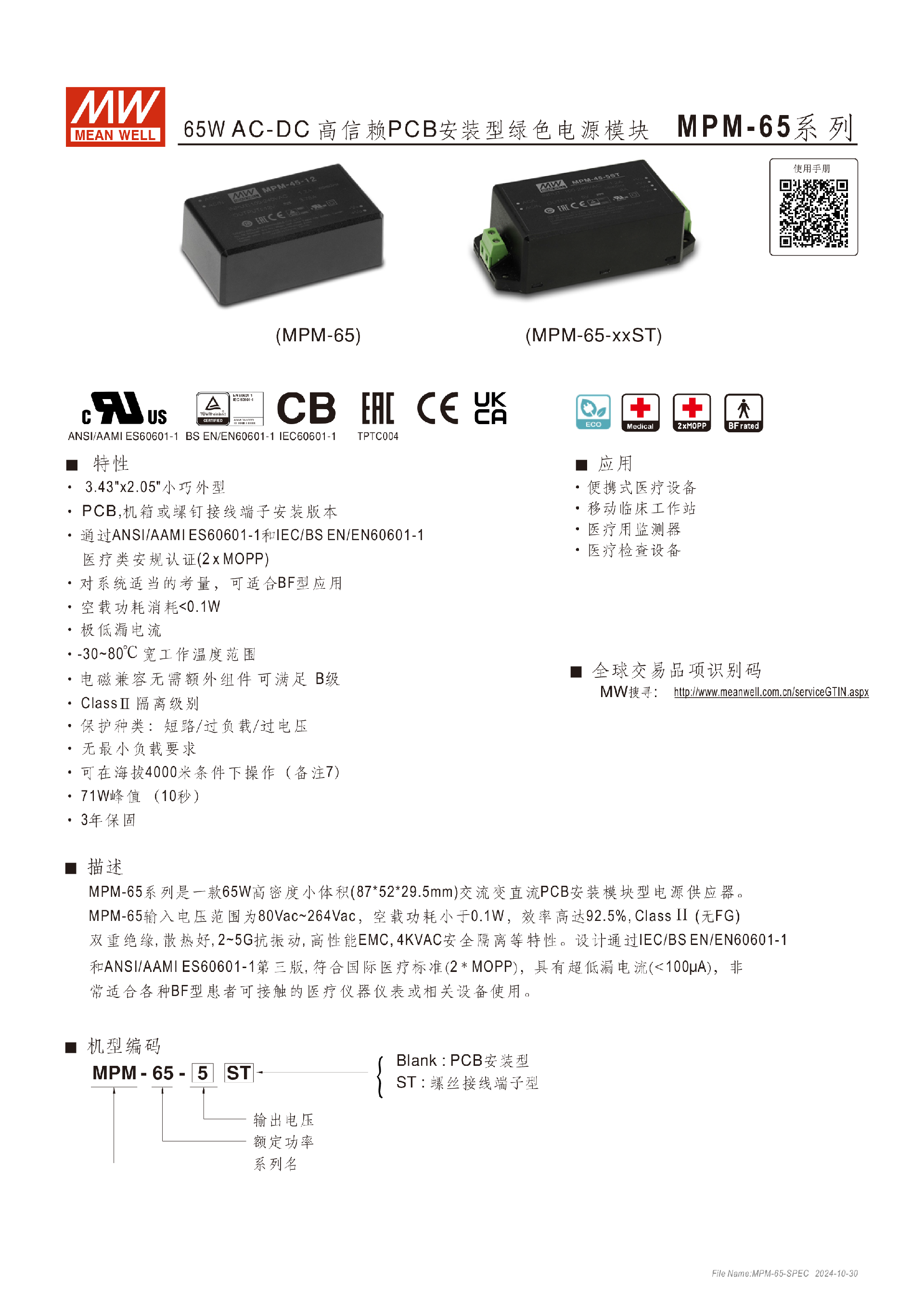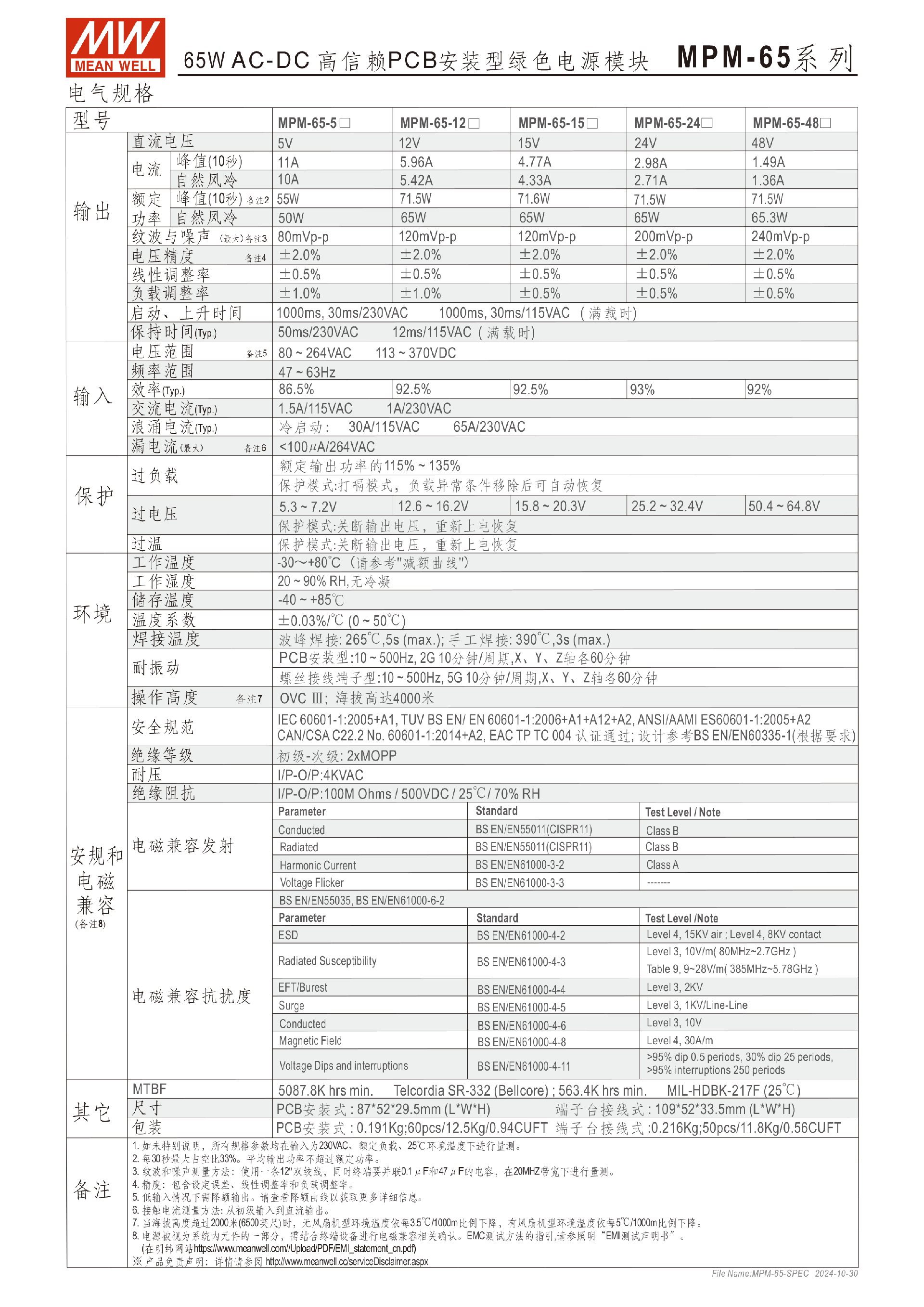 台湾明纬MPM-05系列医疗封闭型电源供应器