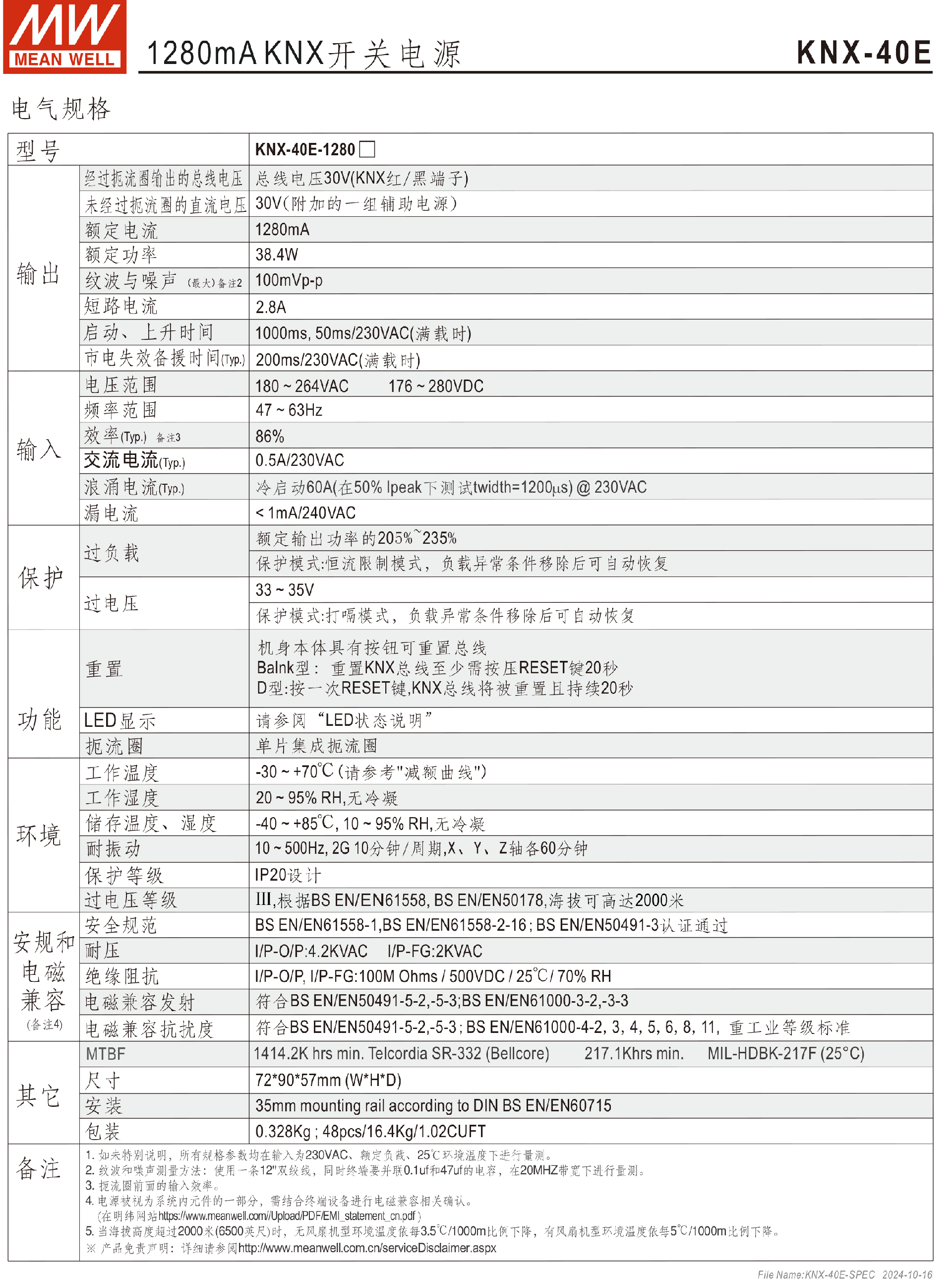 台湾明纬640mA KNX开关电源KNX-20E-640
