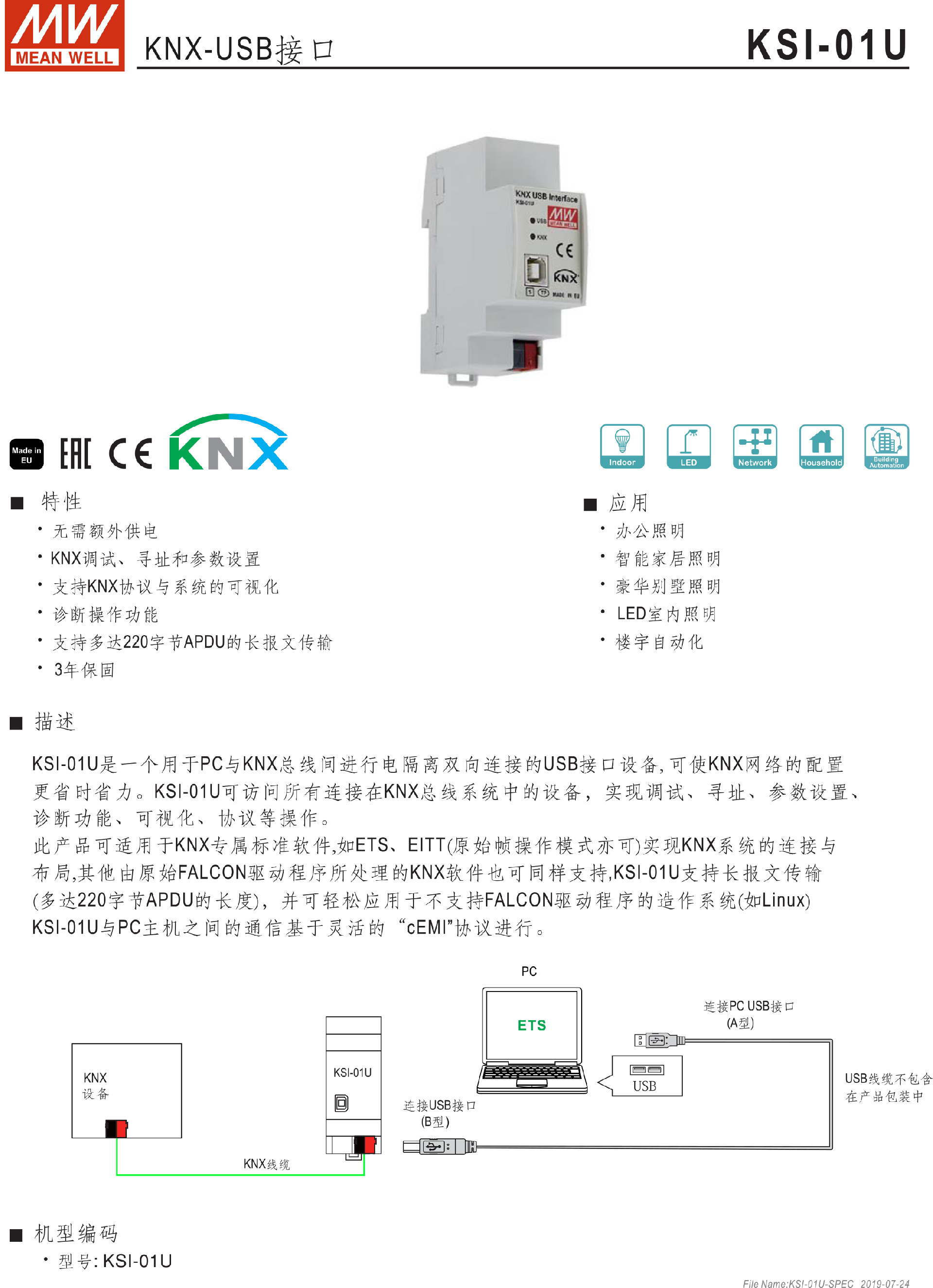 台湾明纬640mA KNX开关电源KNX-20E-640