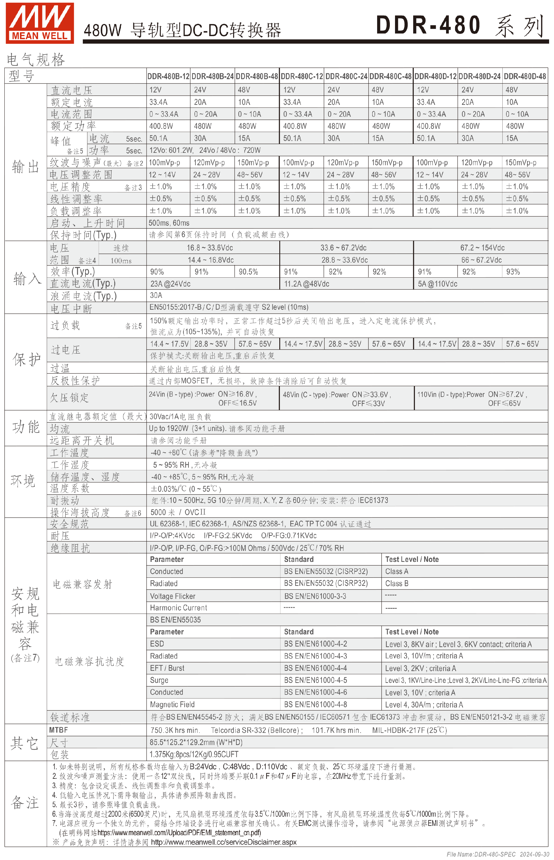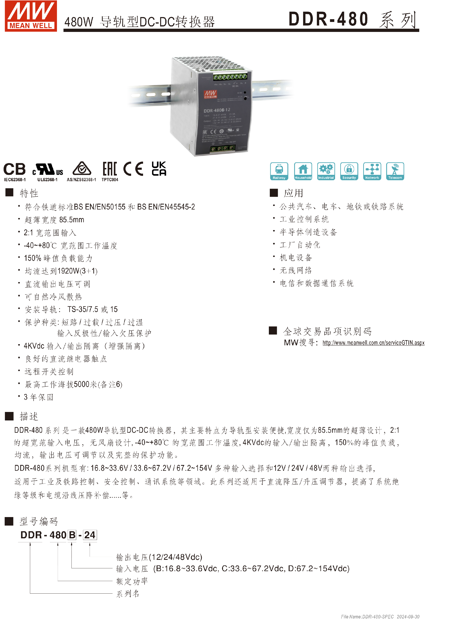 明纬电源DDR-240系列240W导轨型DC-DC转换器