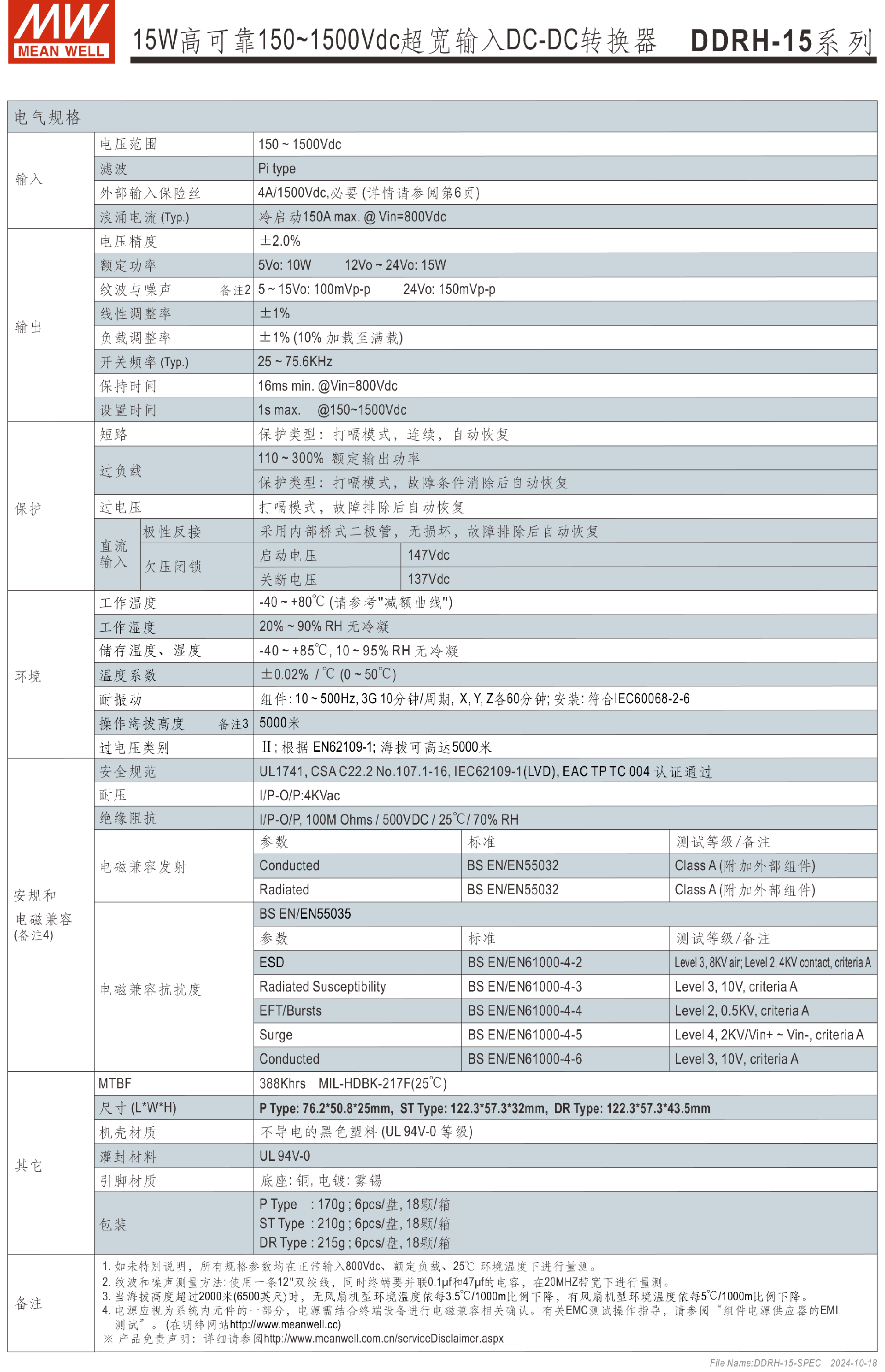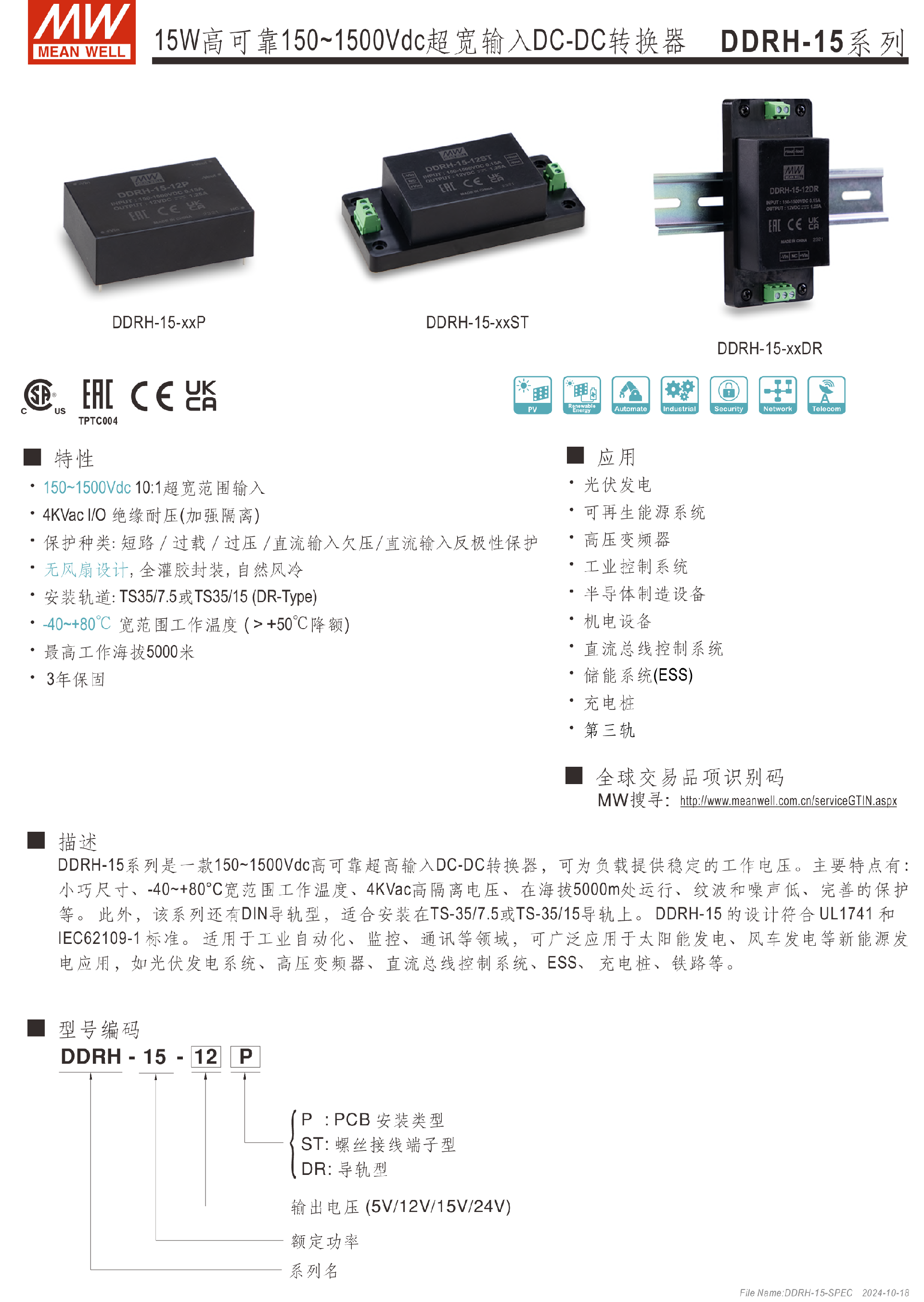 明纬电源DDRH-240系列250~1500Vdc超宽输入DC-DC转换器