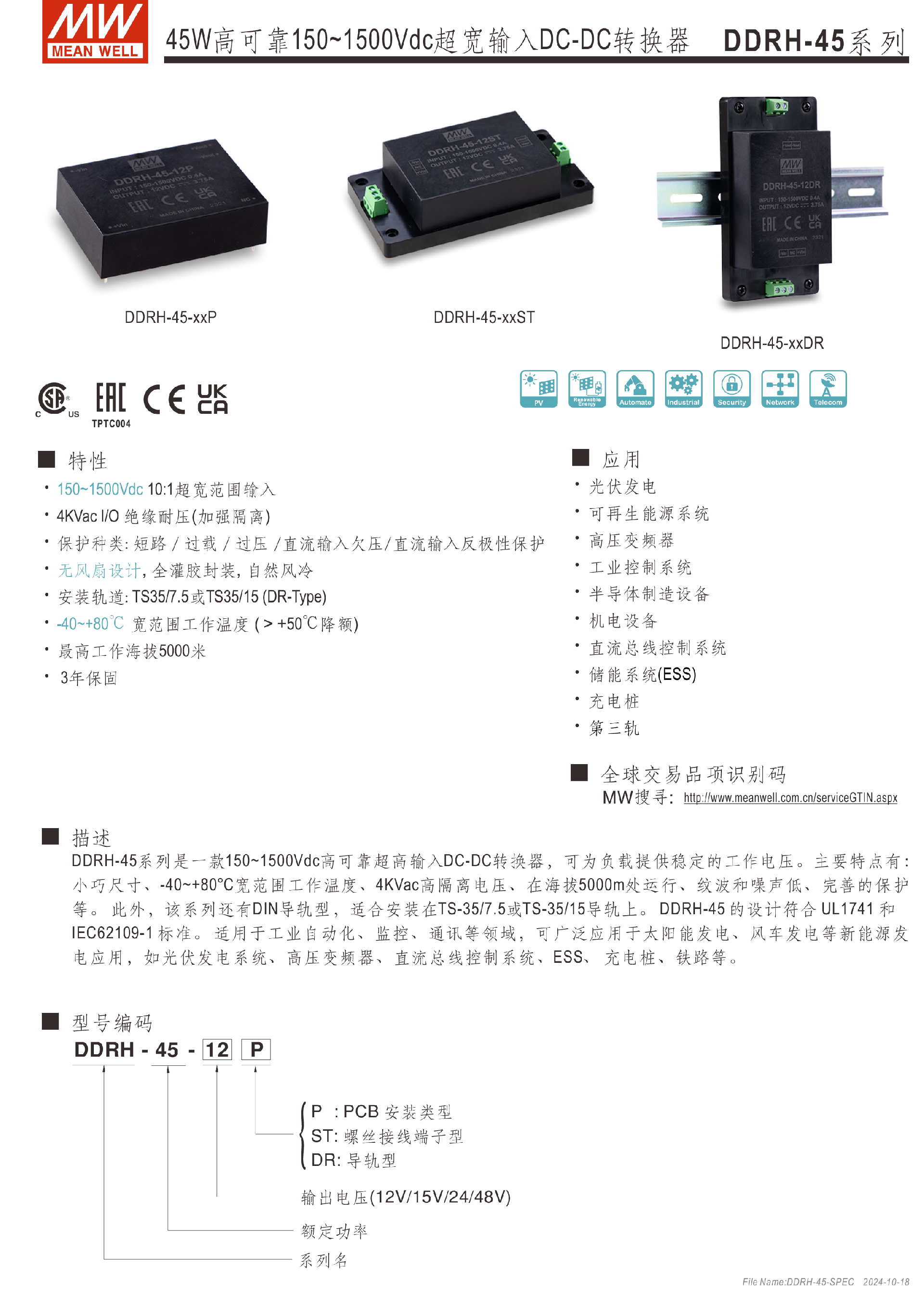 明纬电源DDRH-240系列250~1500Vdc超宽输入DC-DC转换器