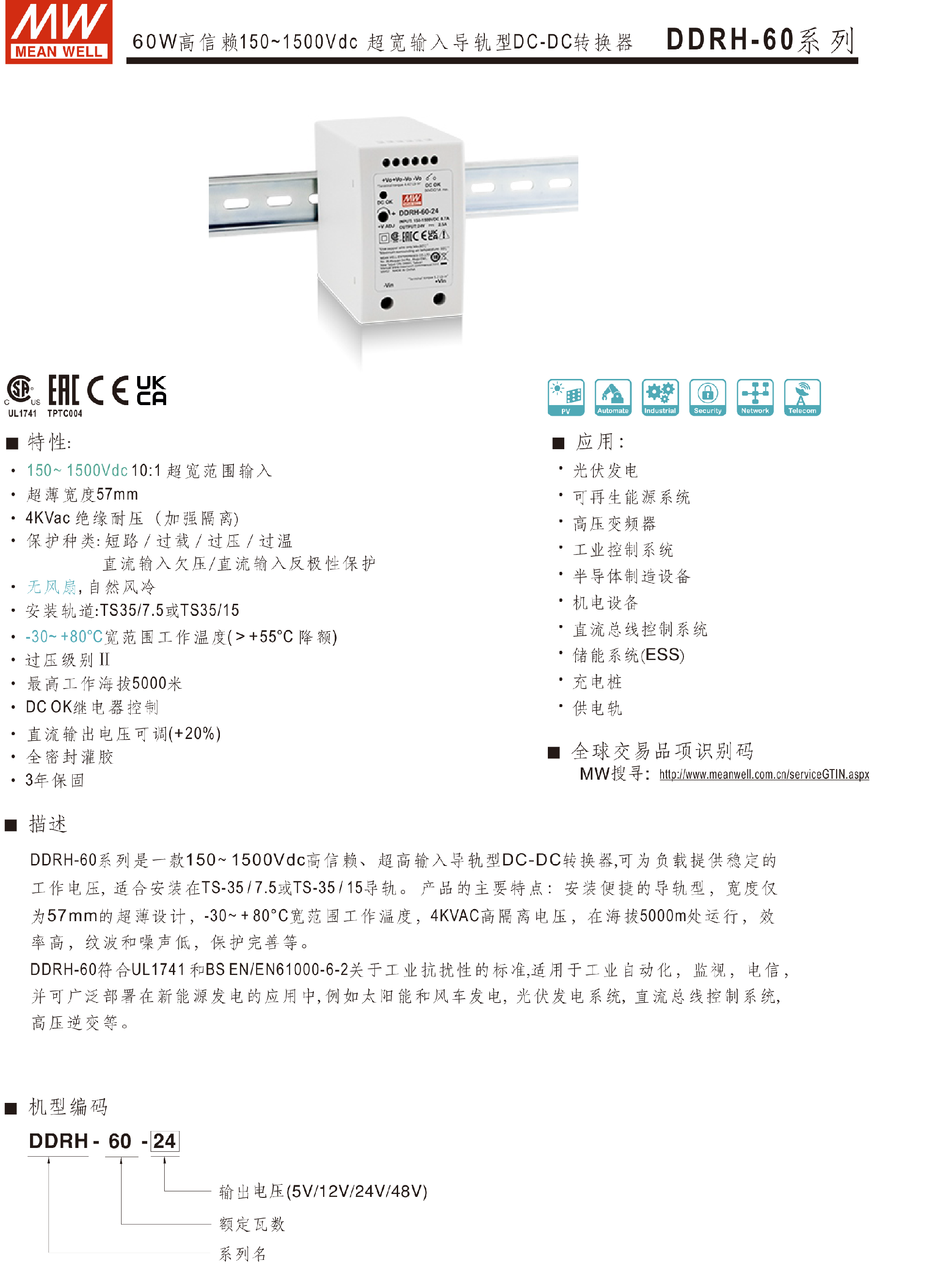 明纬电源DDRH-120系列250~1500Vdc超宽输入DC-DC转换器