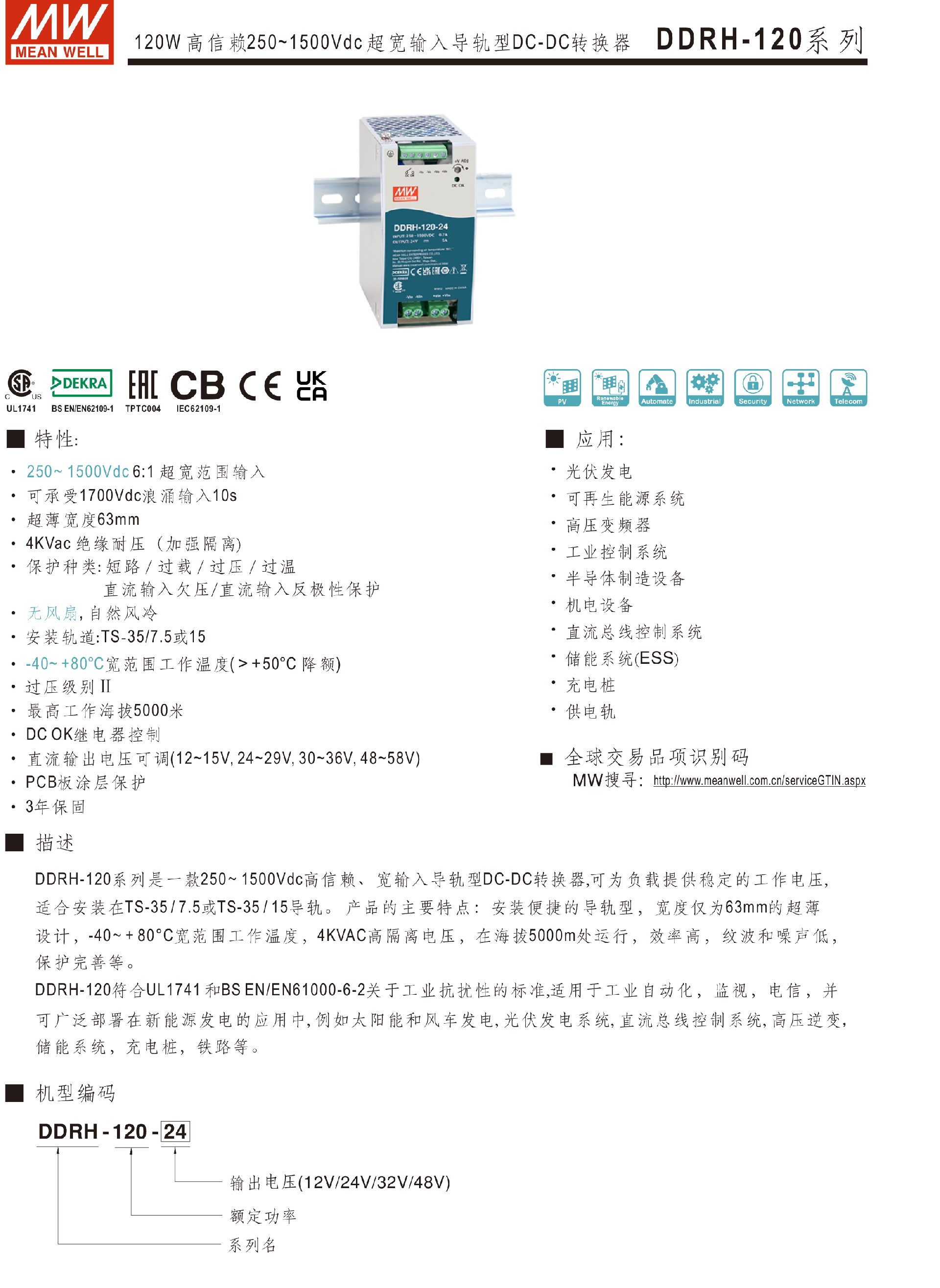 明纬电源DDRH-60系列150~1500Vdc超宽输入DC-DC转换器