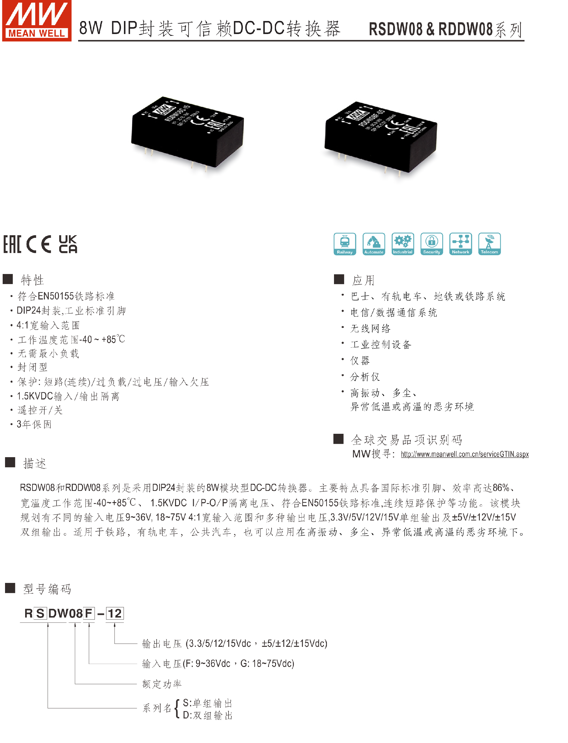 明纬电源SCW08系列8W DC-DC稳压单组输出转换器