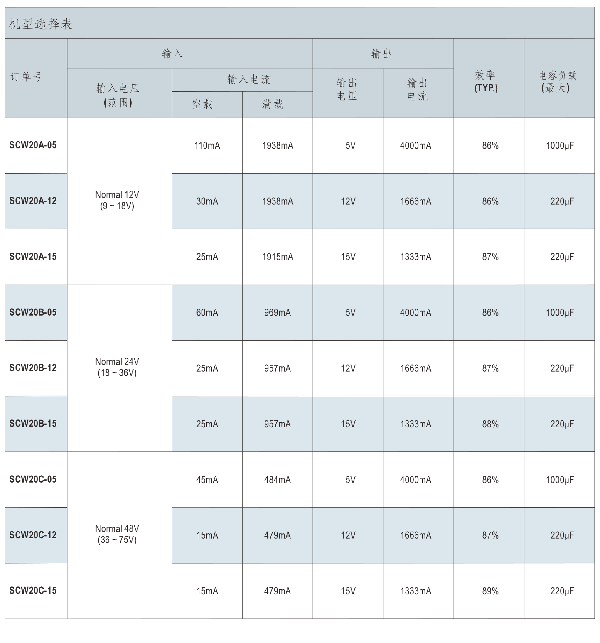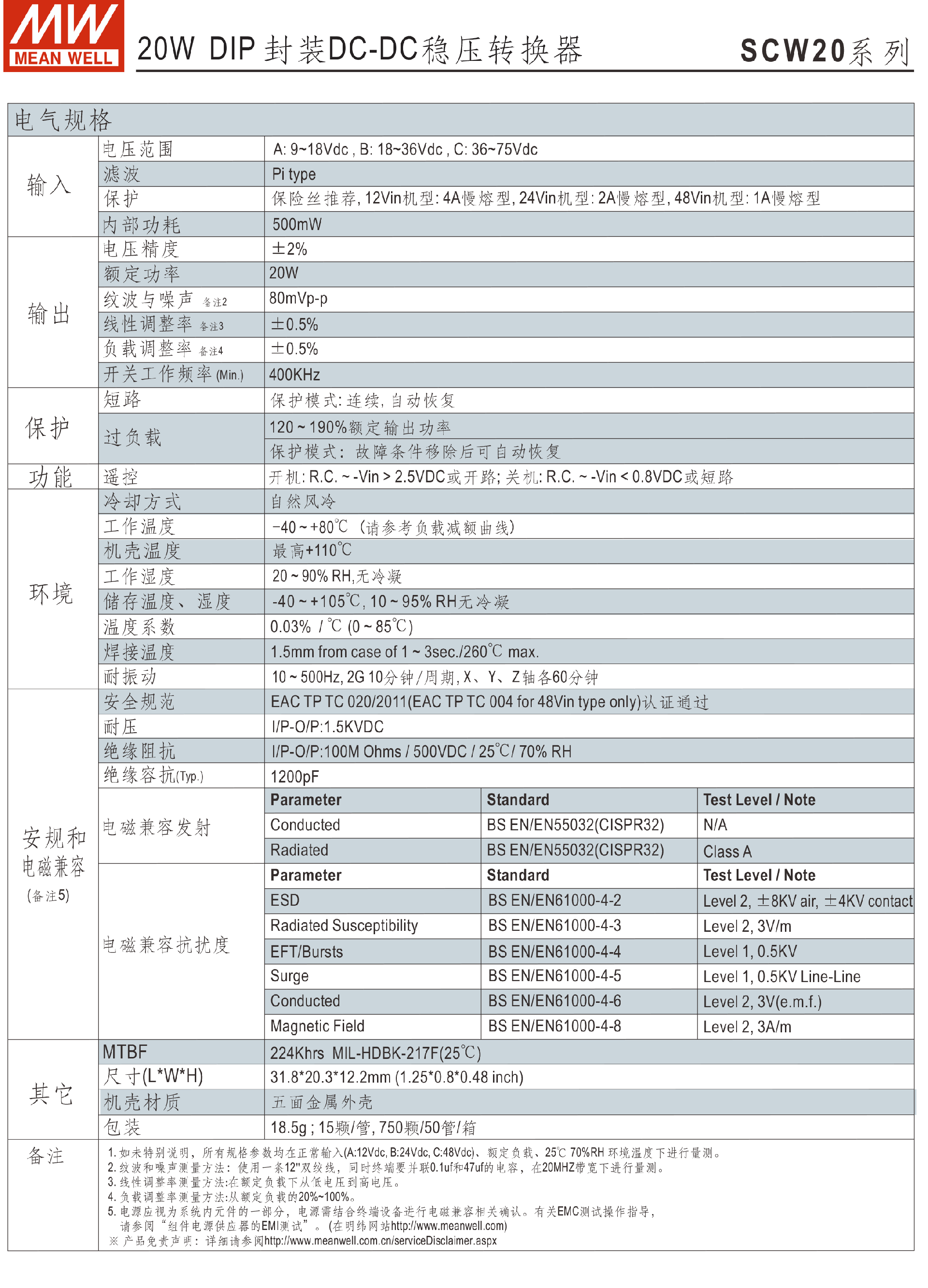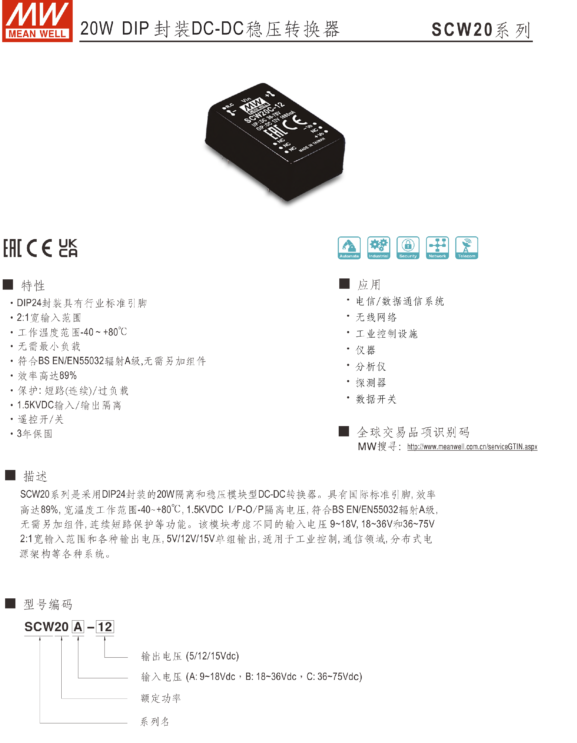 明纬电源SCW12系列12W DC-DC稳压单组输出转换器