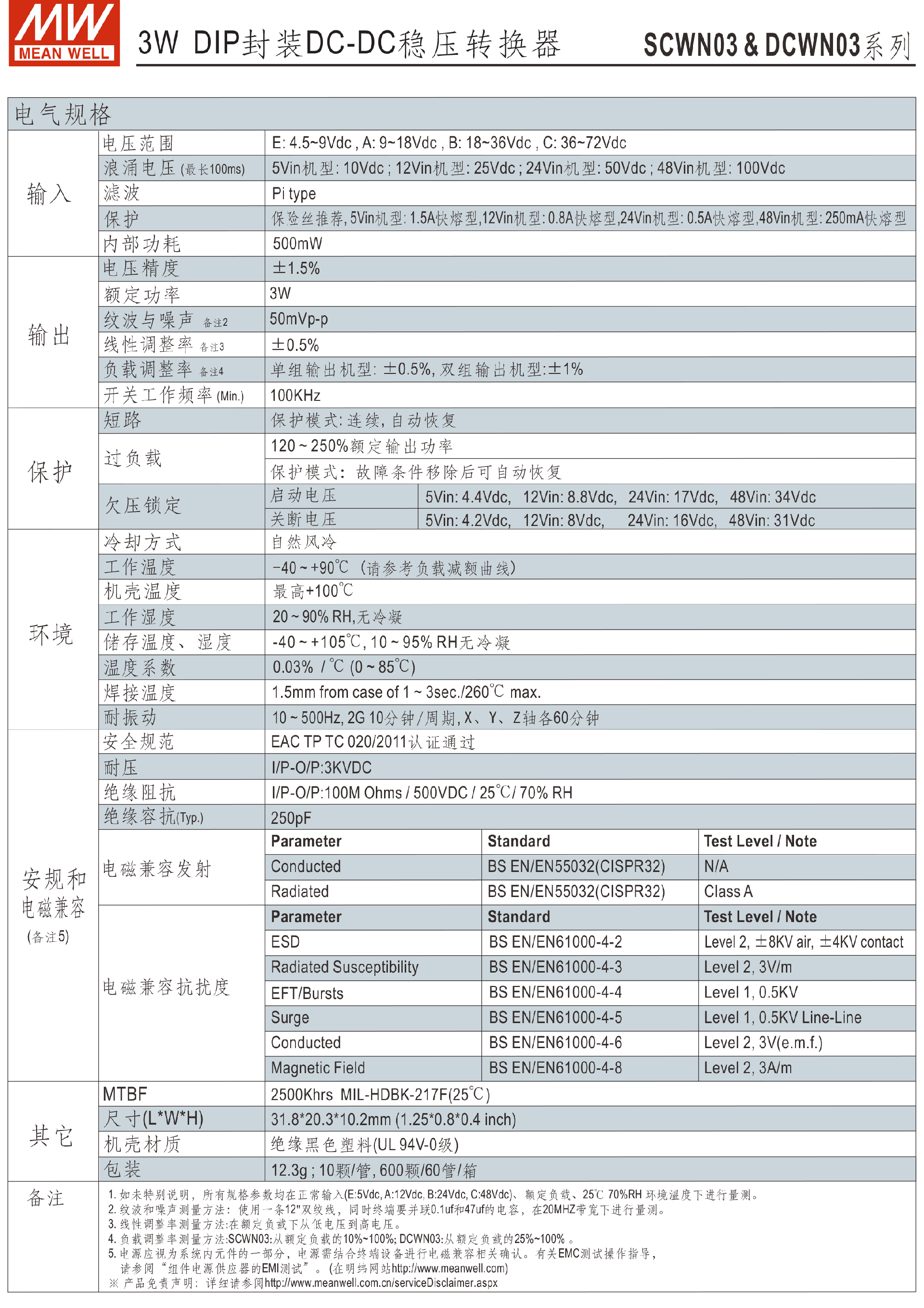 明纬电源SLC03系列单组DLC03系列双组3W DIP封装DC-DC稳压转换器