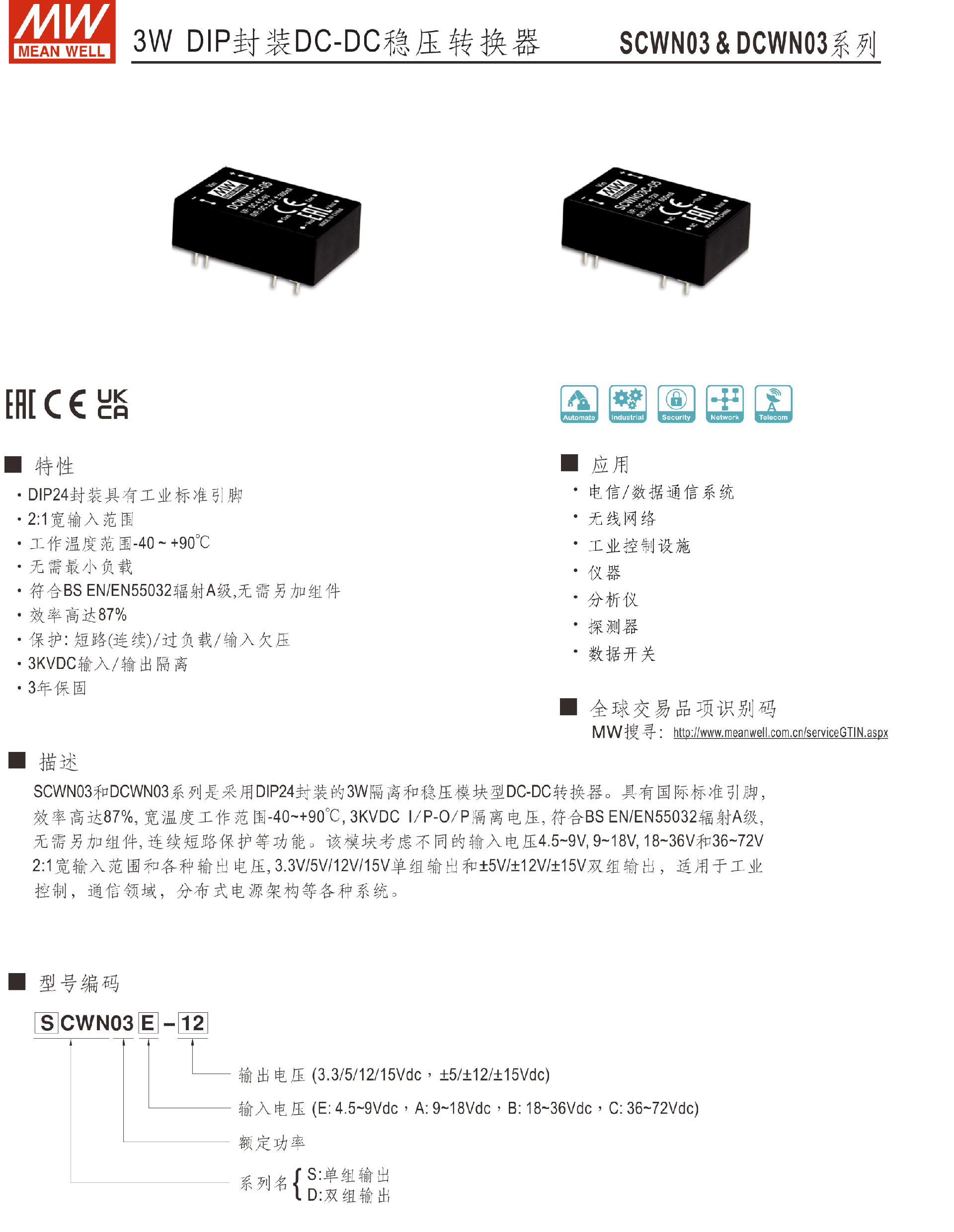 明纬电源SCW12系列12W DC-DC稳压单组输出转换器