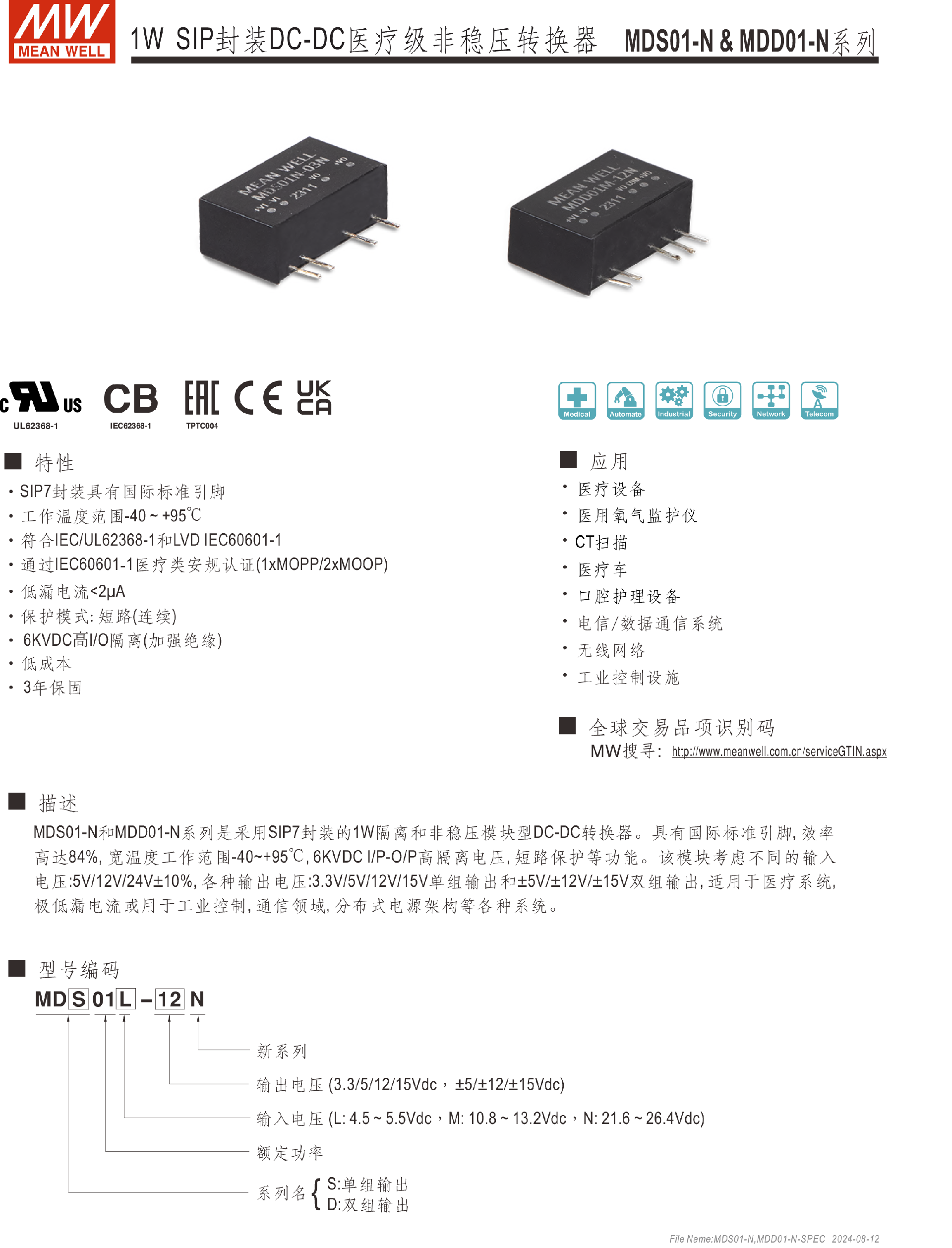 明纬电源MDS15系列15W 封装DC-DC医疗级转换器