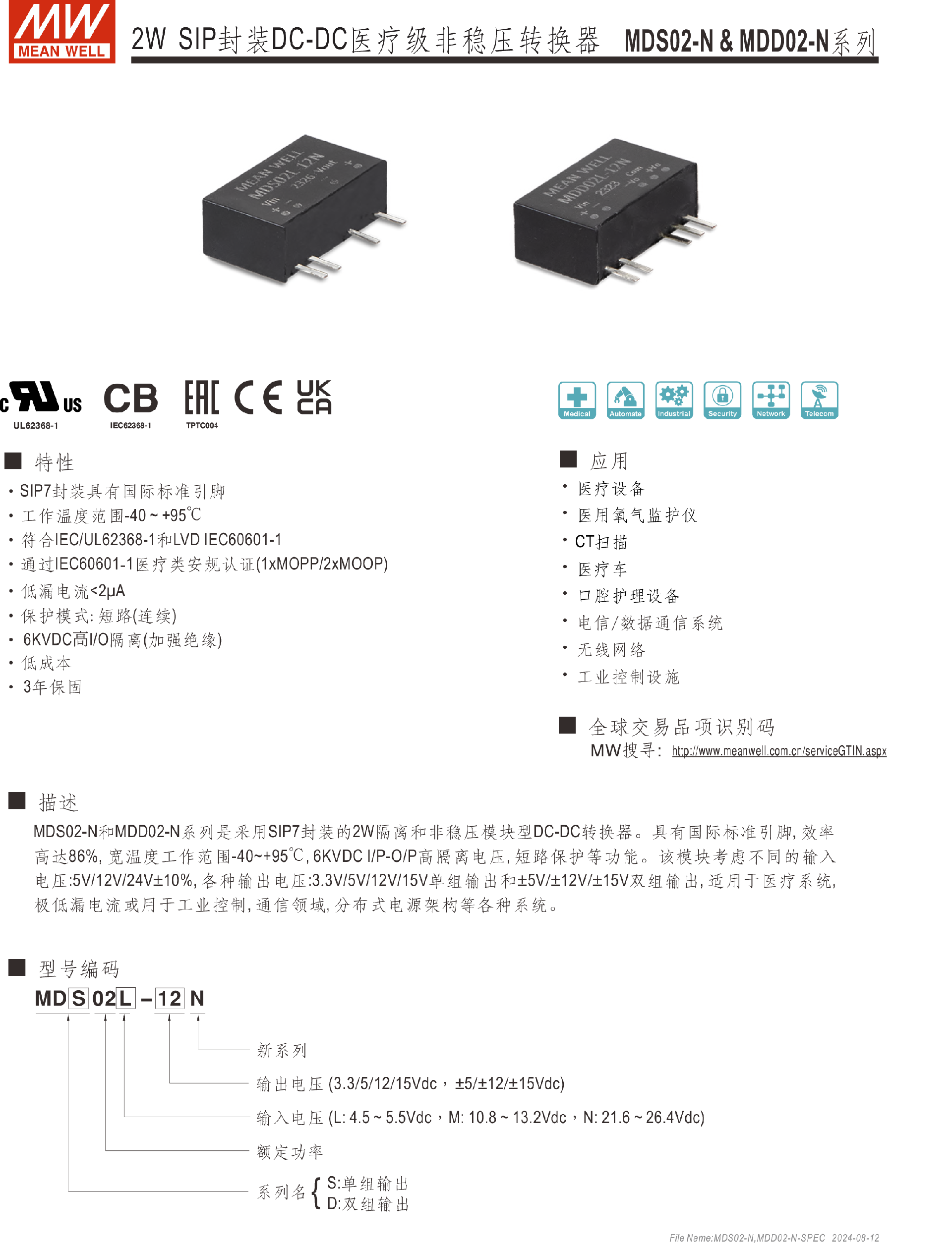 明纬电源MDS01-N单组MDD01-N双组1W SIP封装DC-DC医疗级非稳压转换器