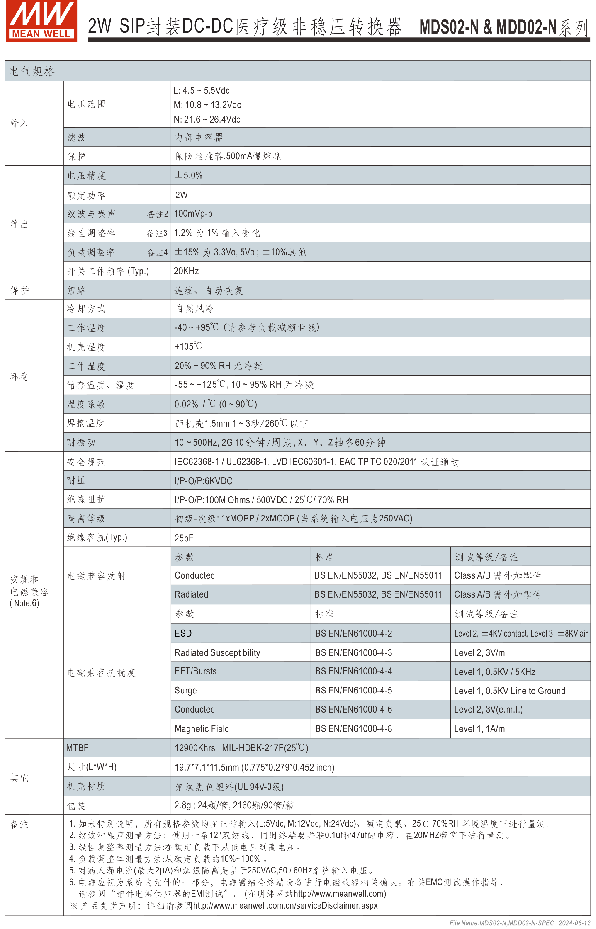 明纬电源MDS06单组MDD06双组6W DIP封装DC-DC医疗级稳压转换器