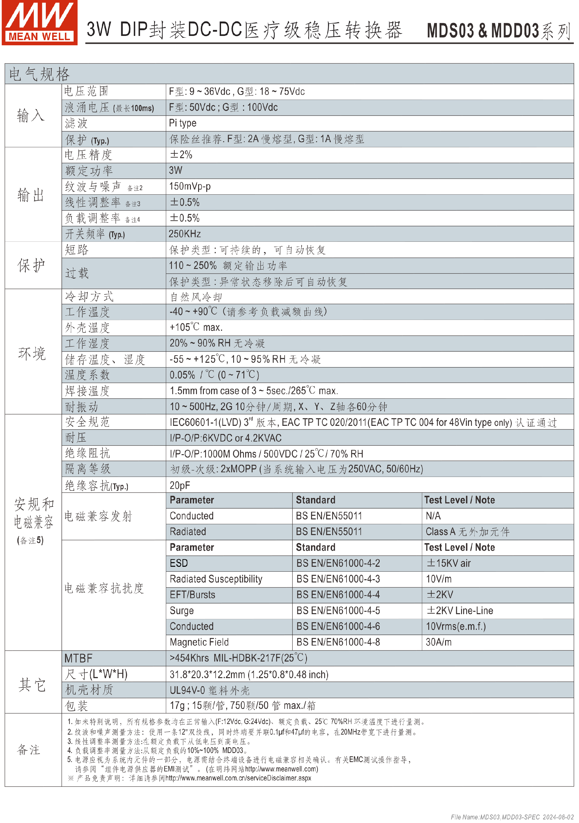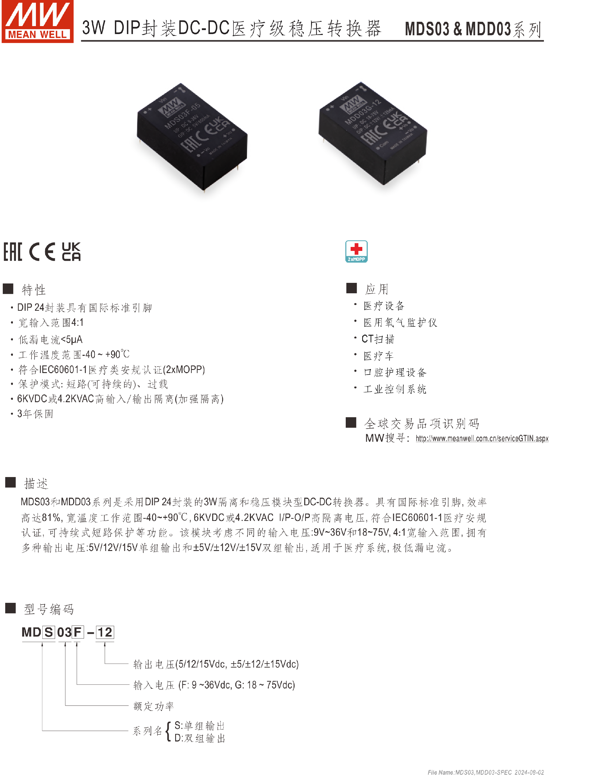 明纬电源MDS06单组MDD06双组6W DIP封装DC-DC医疗级稳压转换器