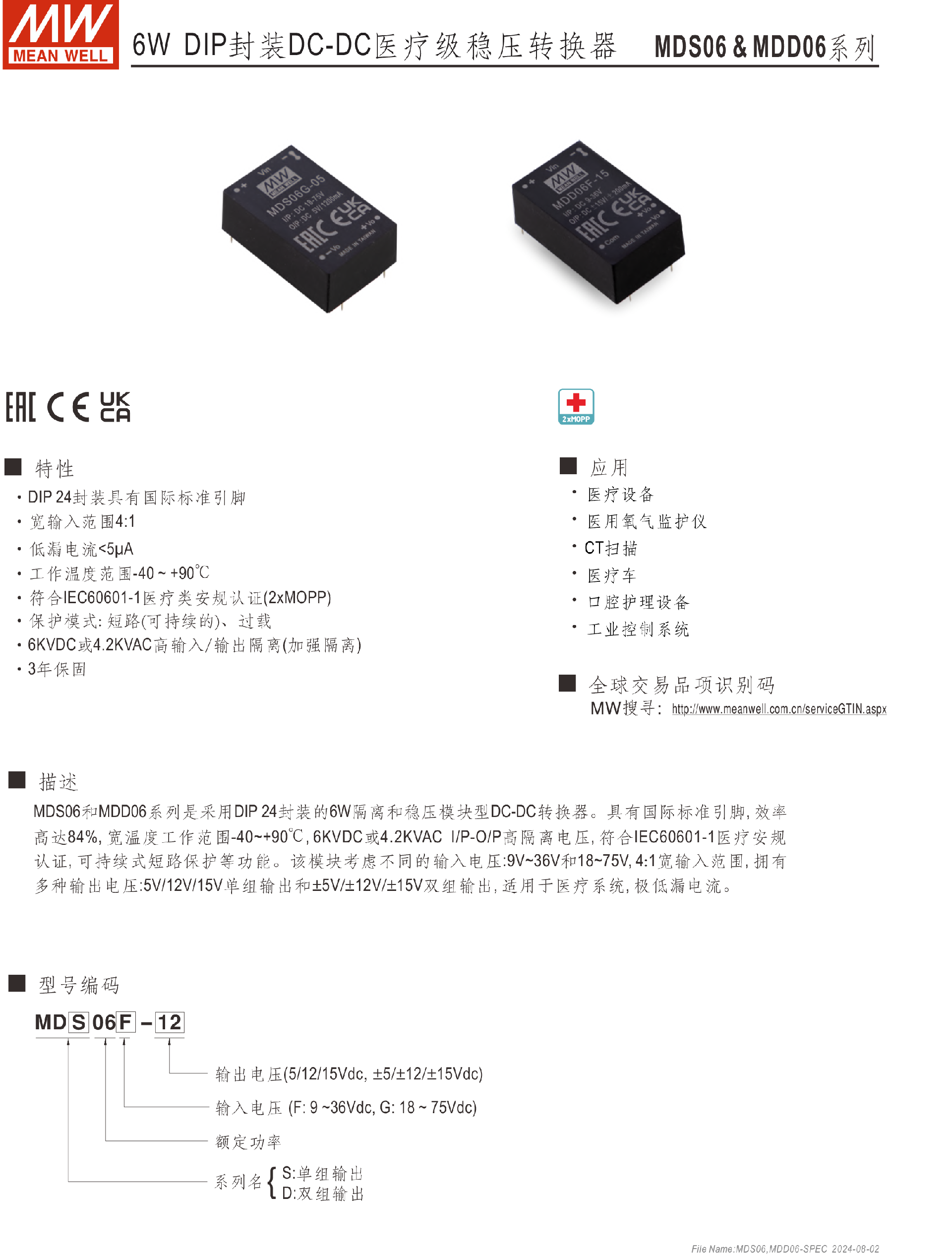 明纬电源MDS03单组MDD03双组3W DIP封装DC-DC医疗级稳压转换器