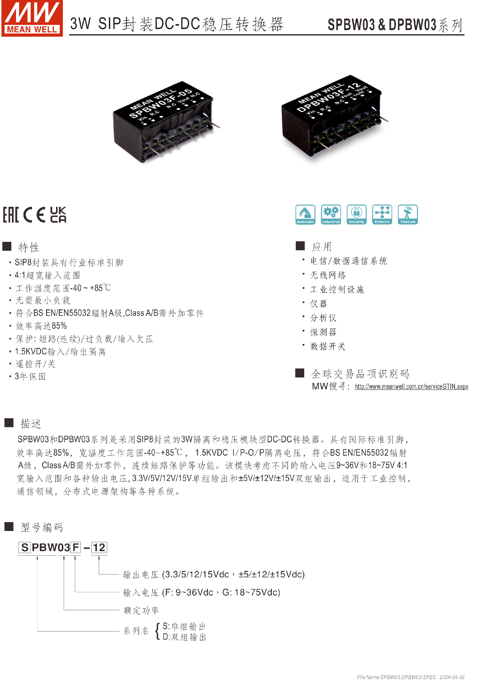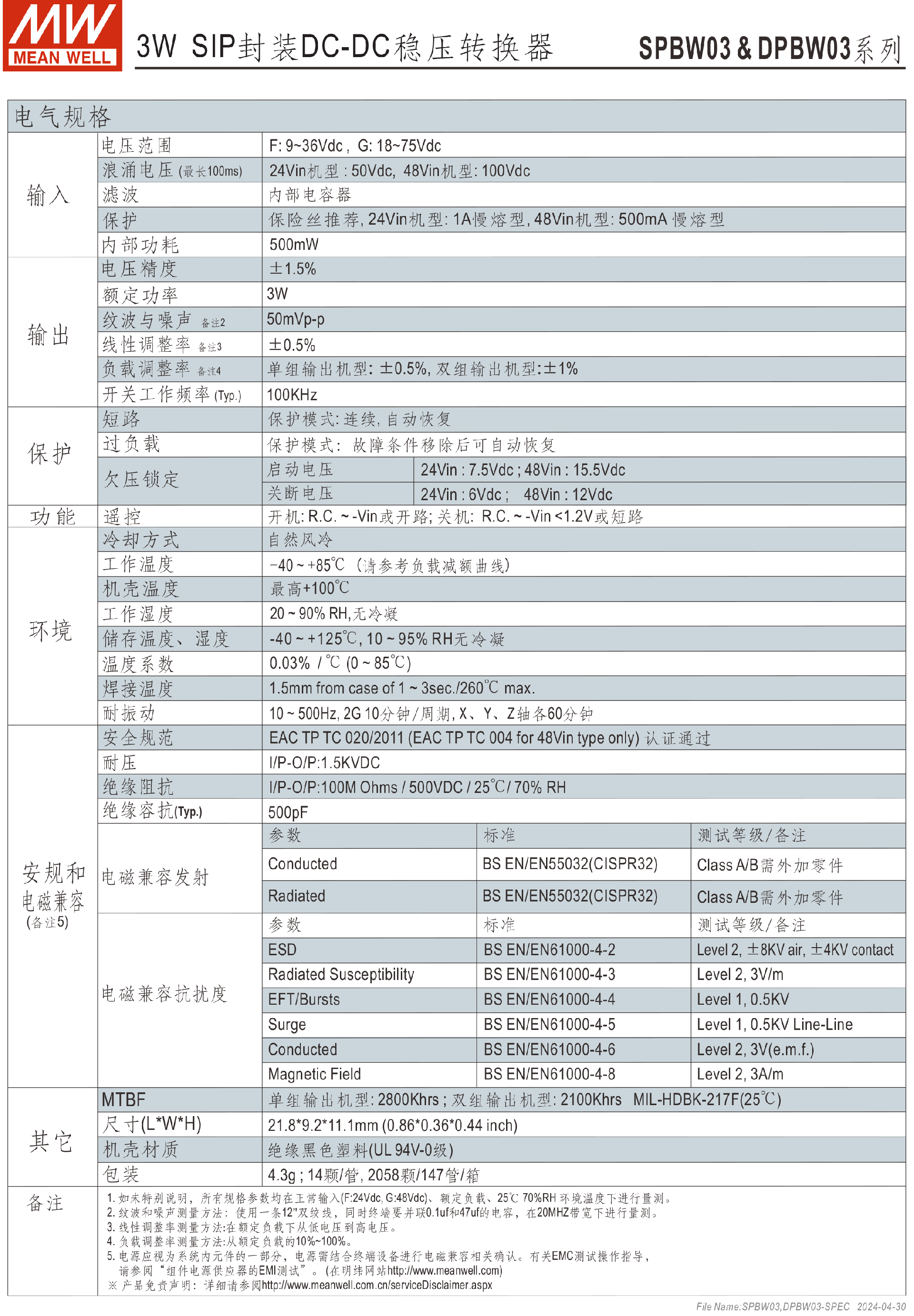 明纬电源SPBW06单组DPBW06双组6W SIP封装DC-DC稳压转换器