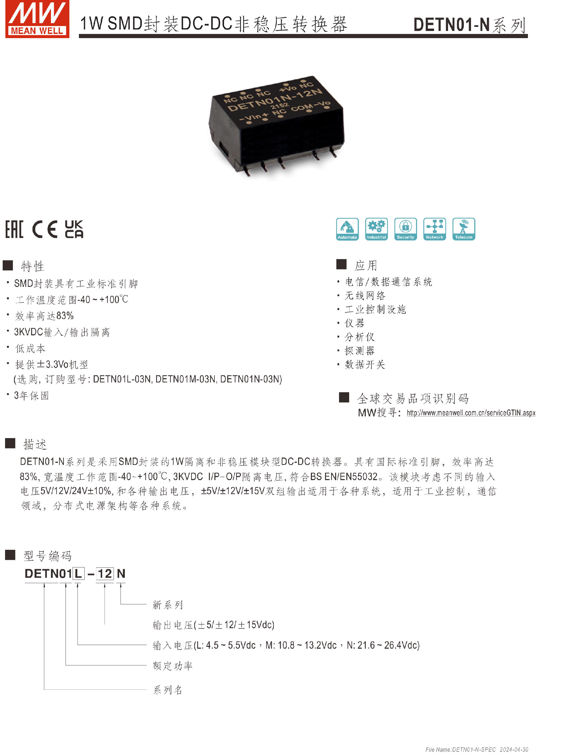 明纬电源DETN02系列2W SMD封装DC-DC非稳压转换器