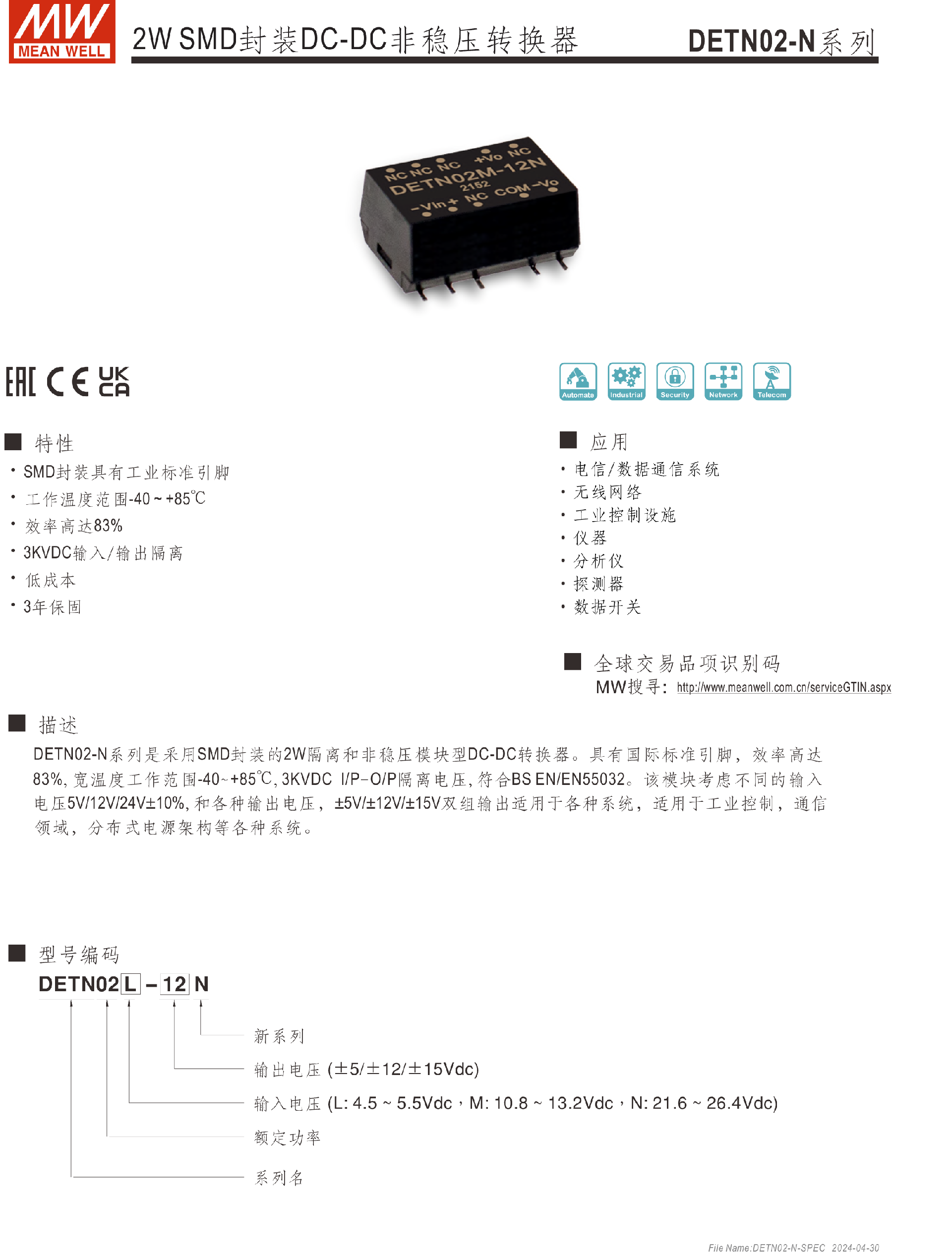 明纬电源DETN02系列2W SMD封装DC-DC非稳压转换器