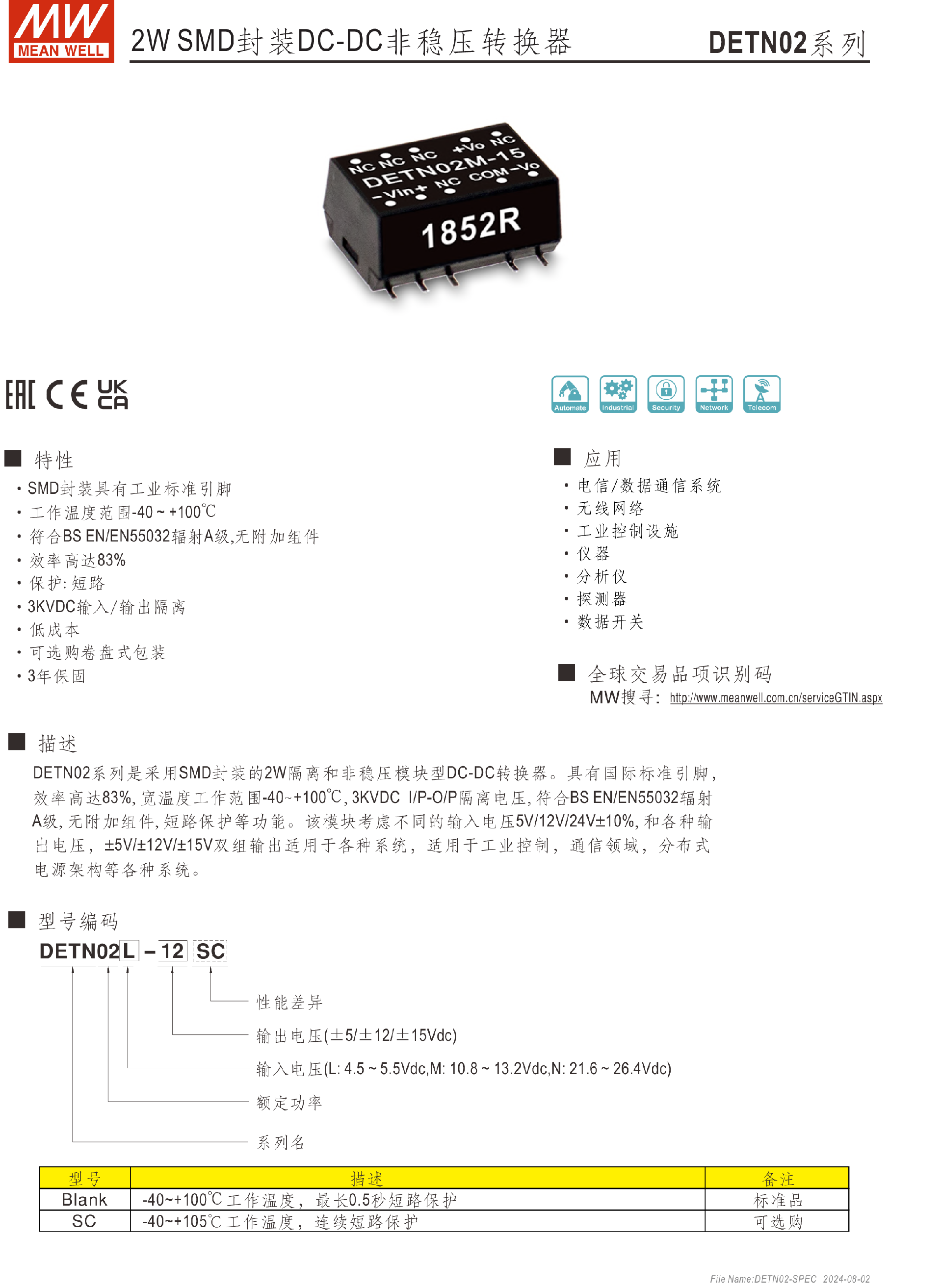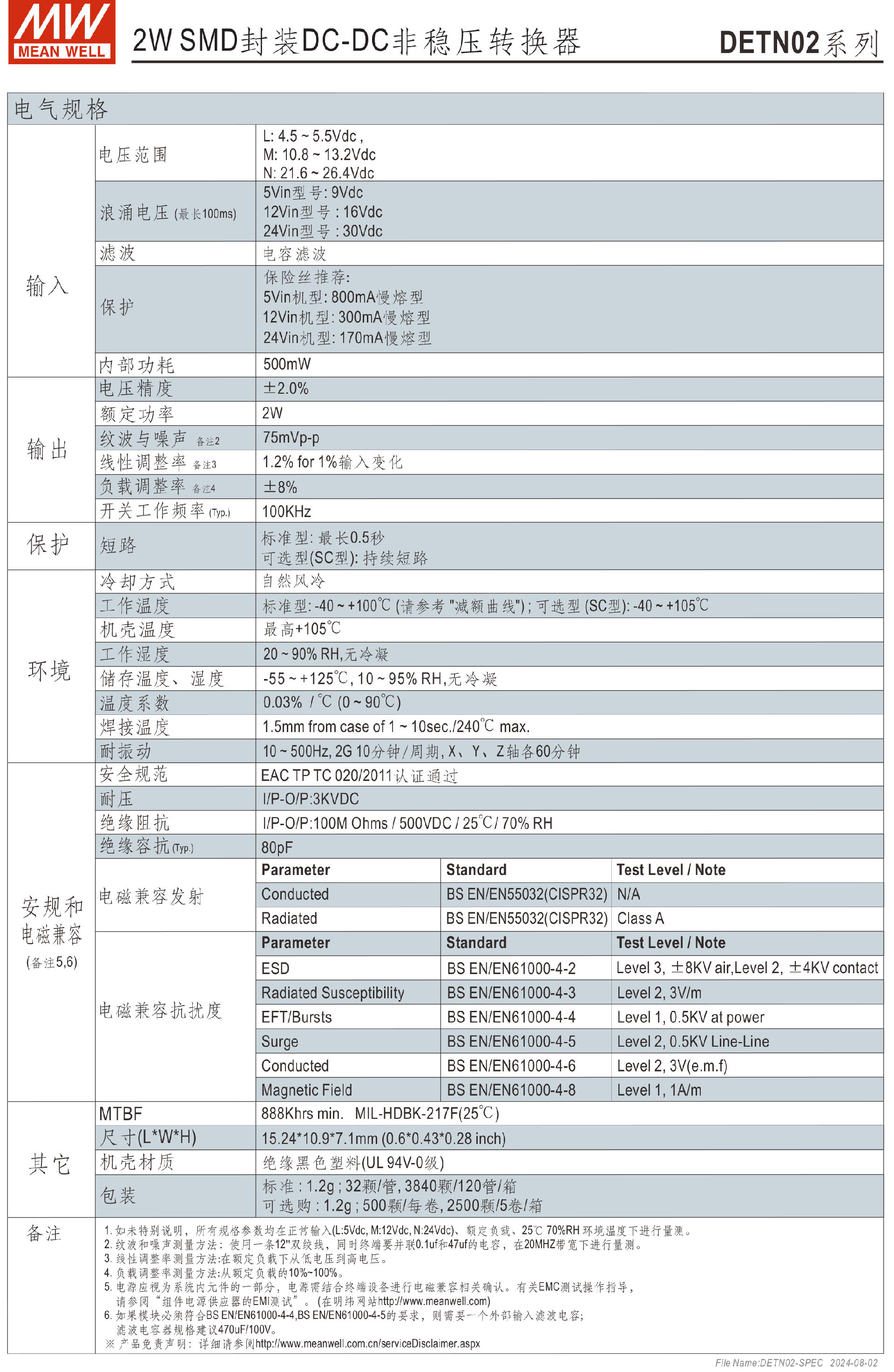 明纬电源DETN02-N系列2W SMD封装DC-DC非稳压转换器