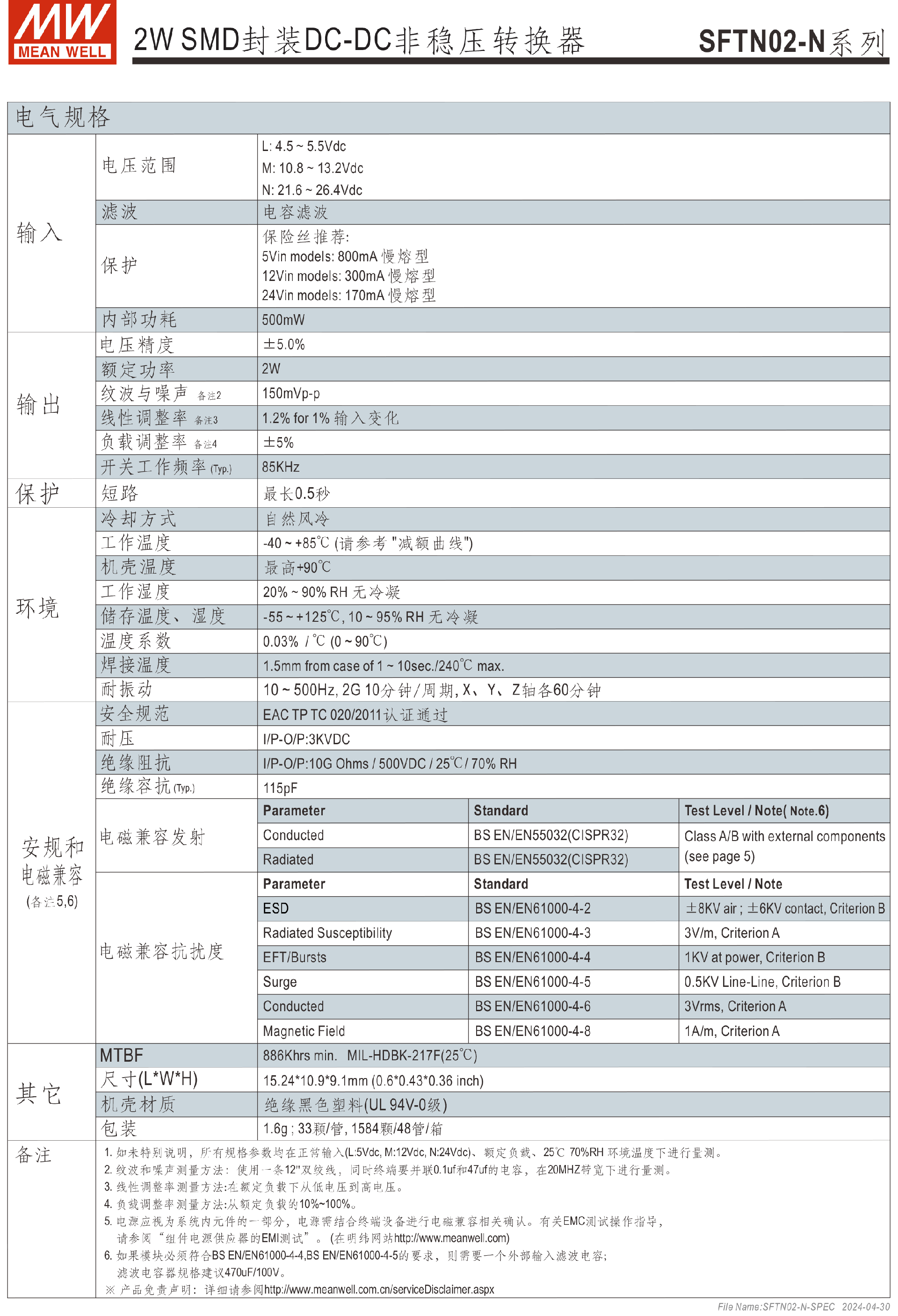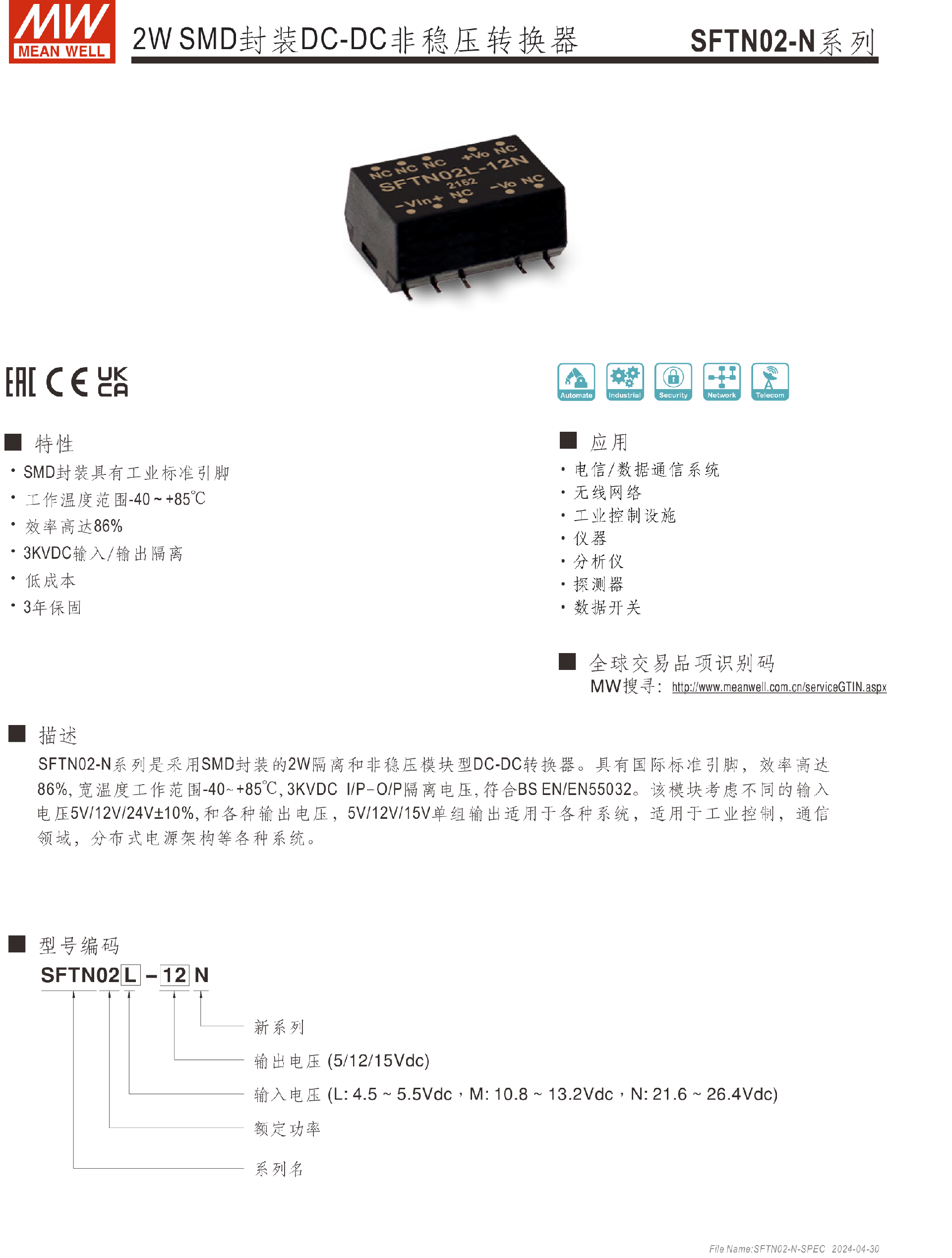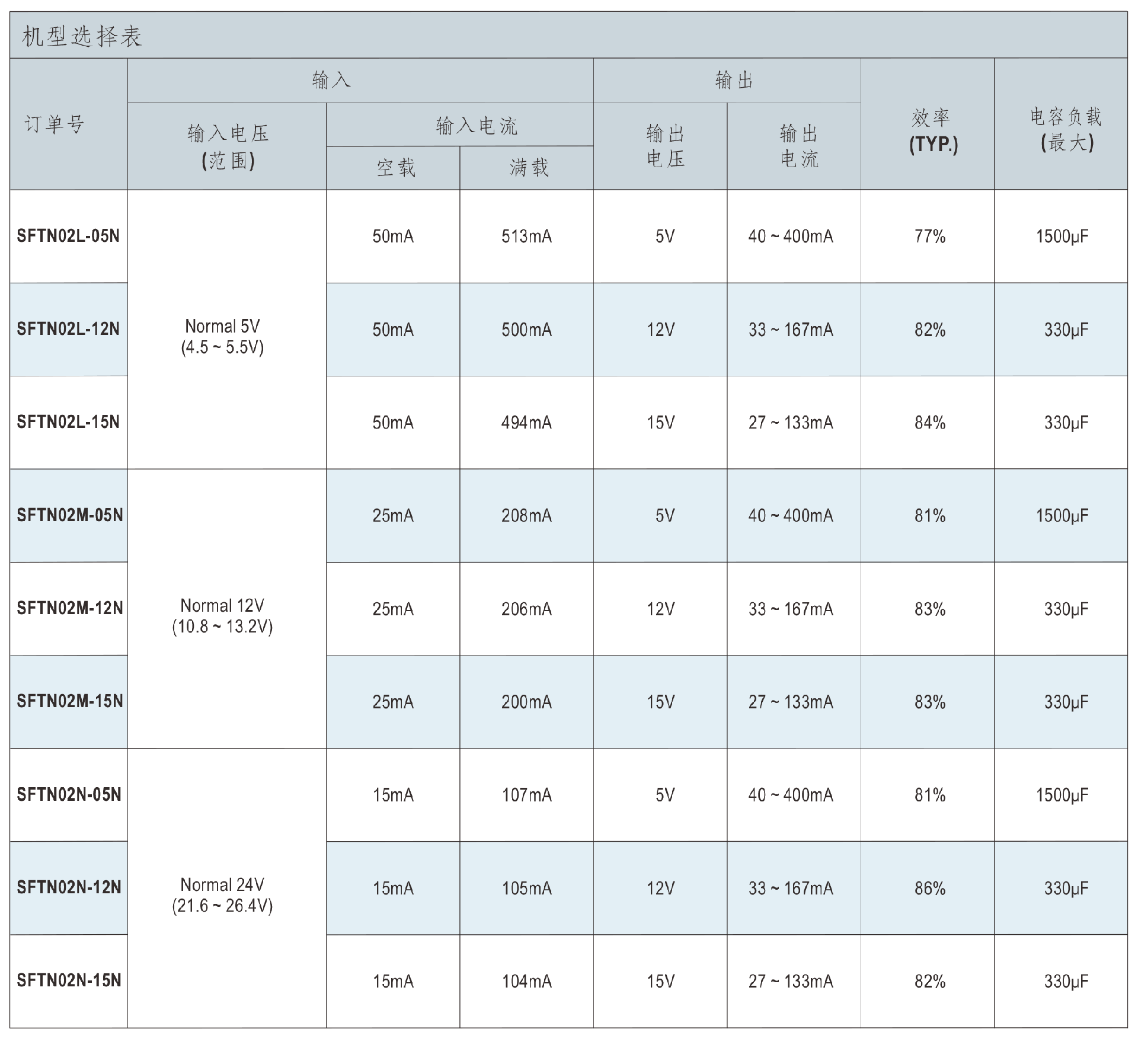 明纬电源SFTN02系列2W SMD封装DC-DC非稳压转换器