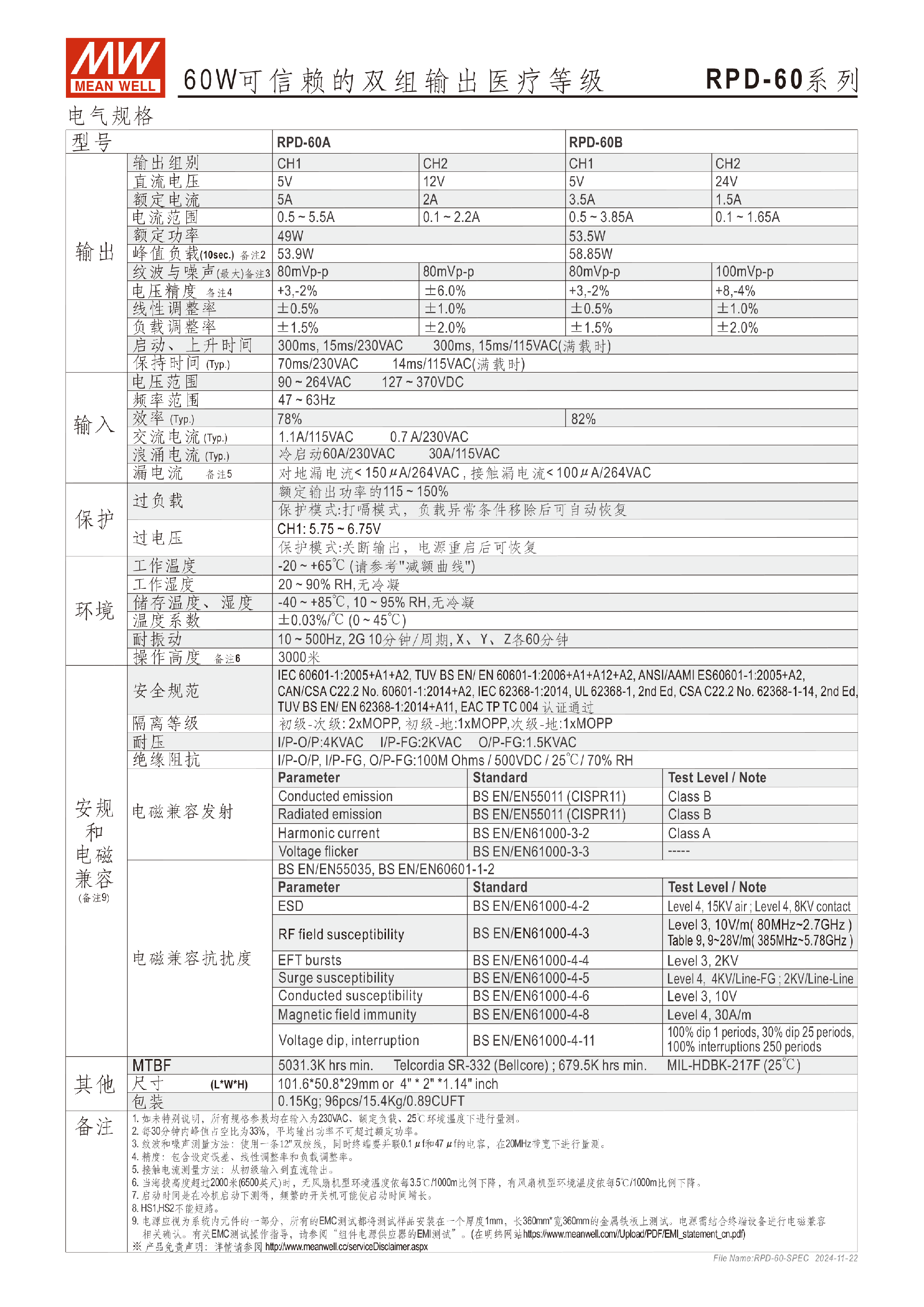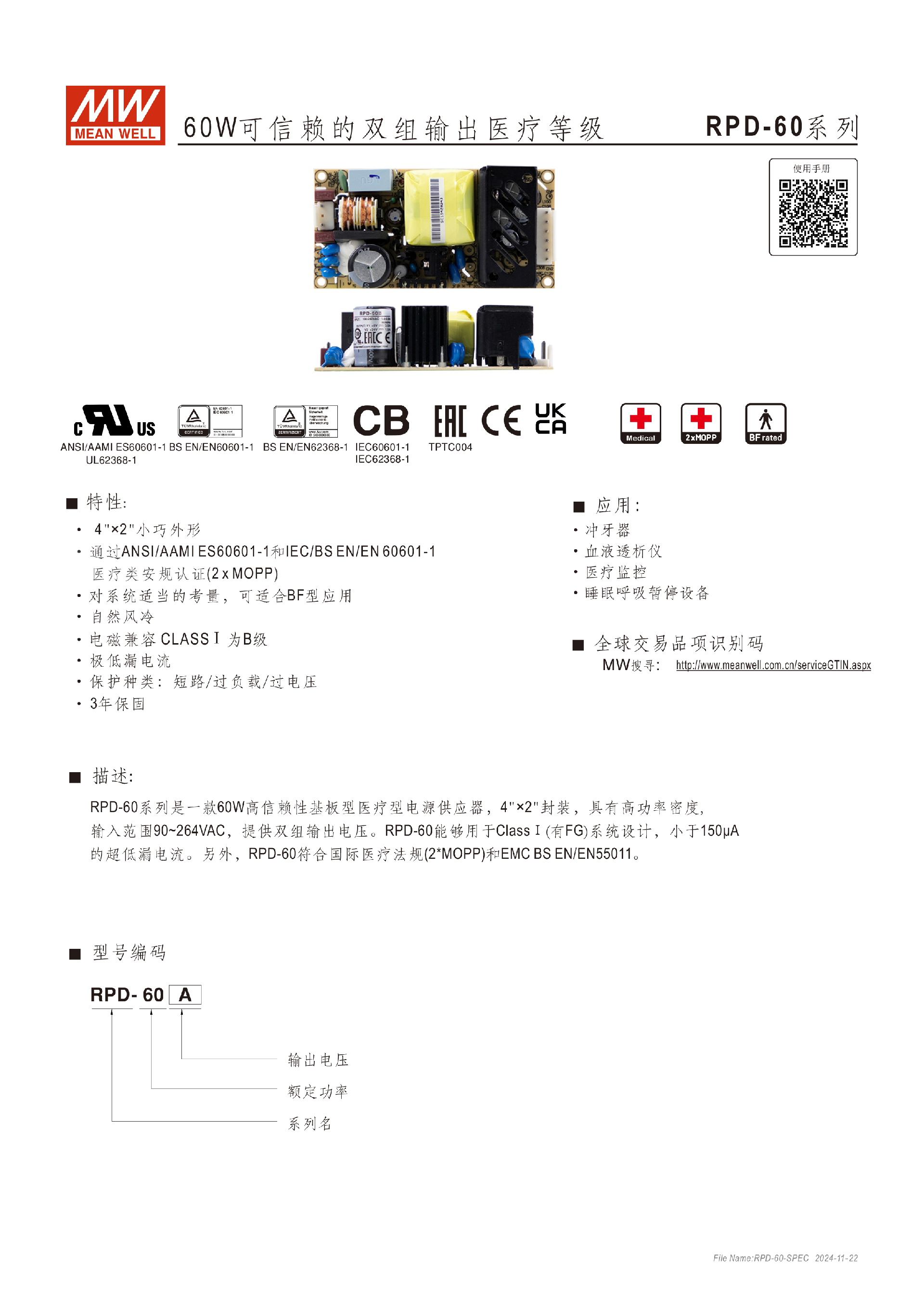 台湾明纬RPT-60系列三组输出医疗电源供应器