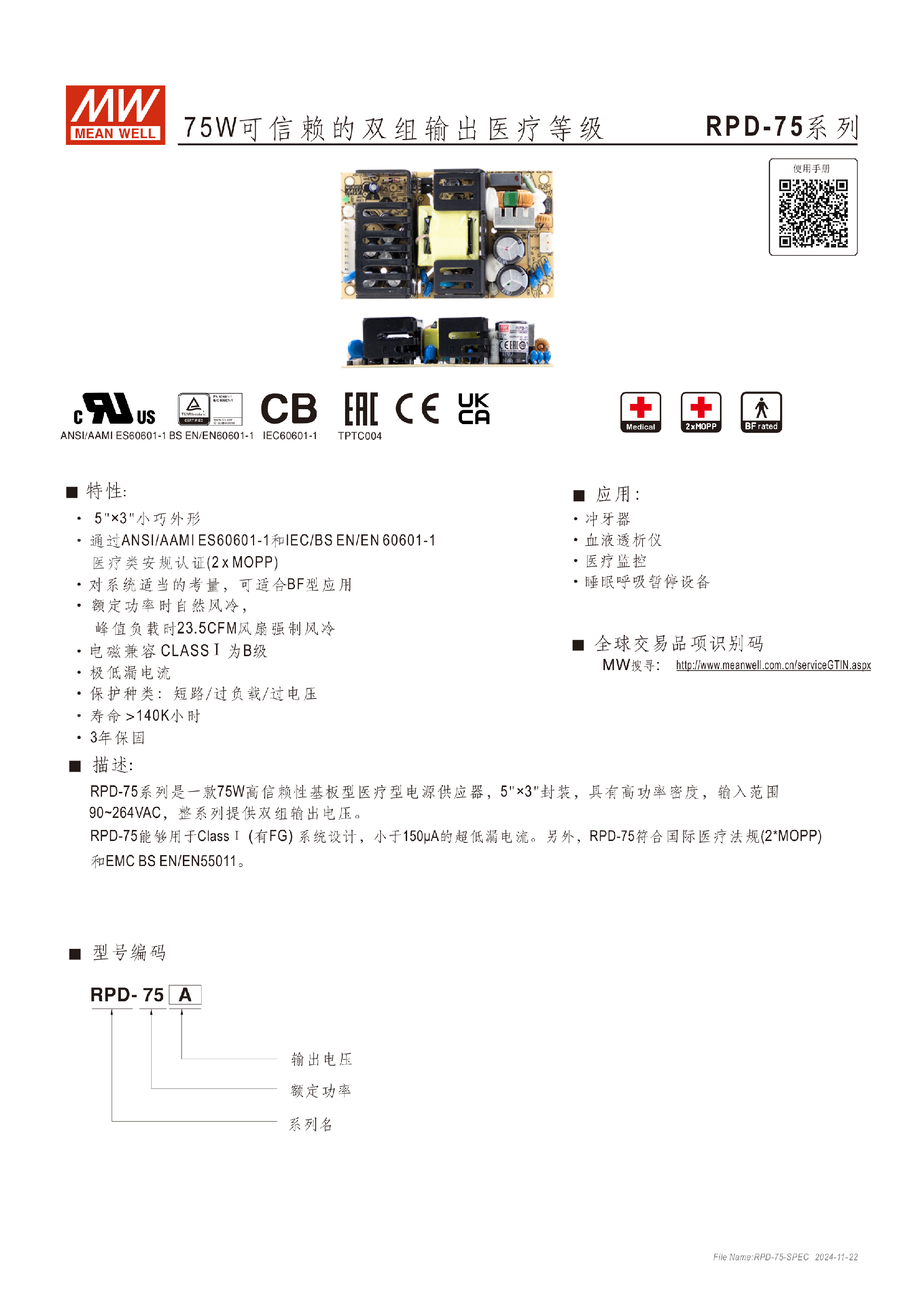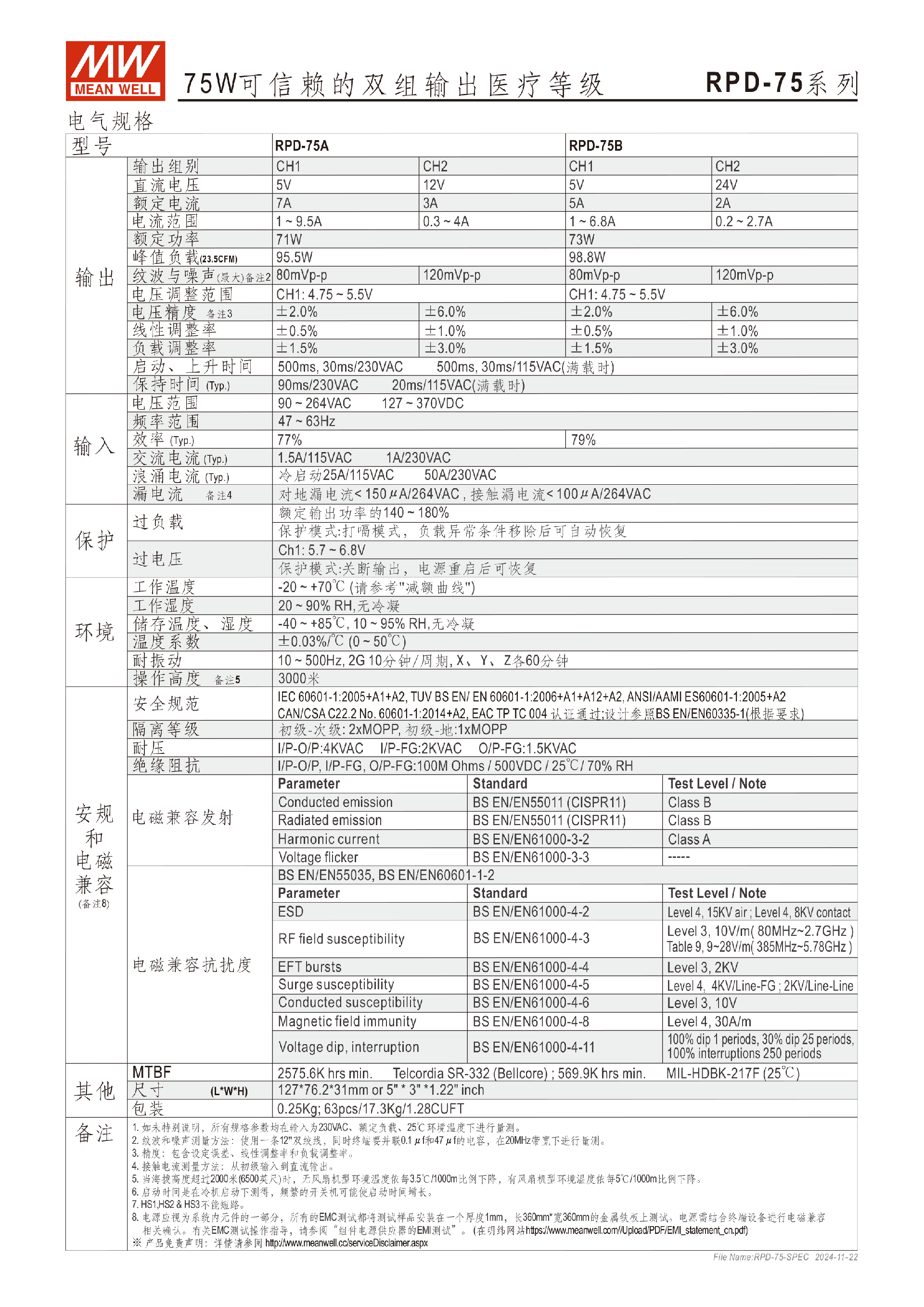 台湾明纬RPS-75系列75W医疗型电源供应器