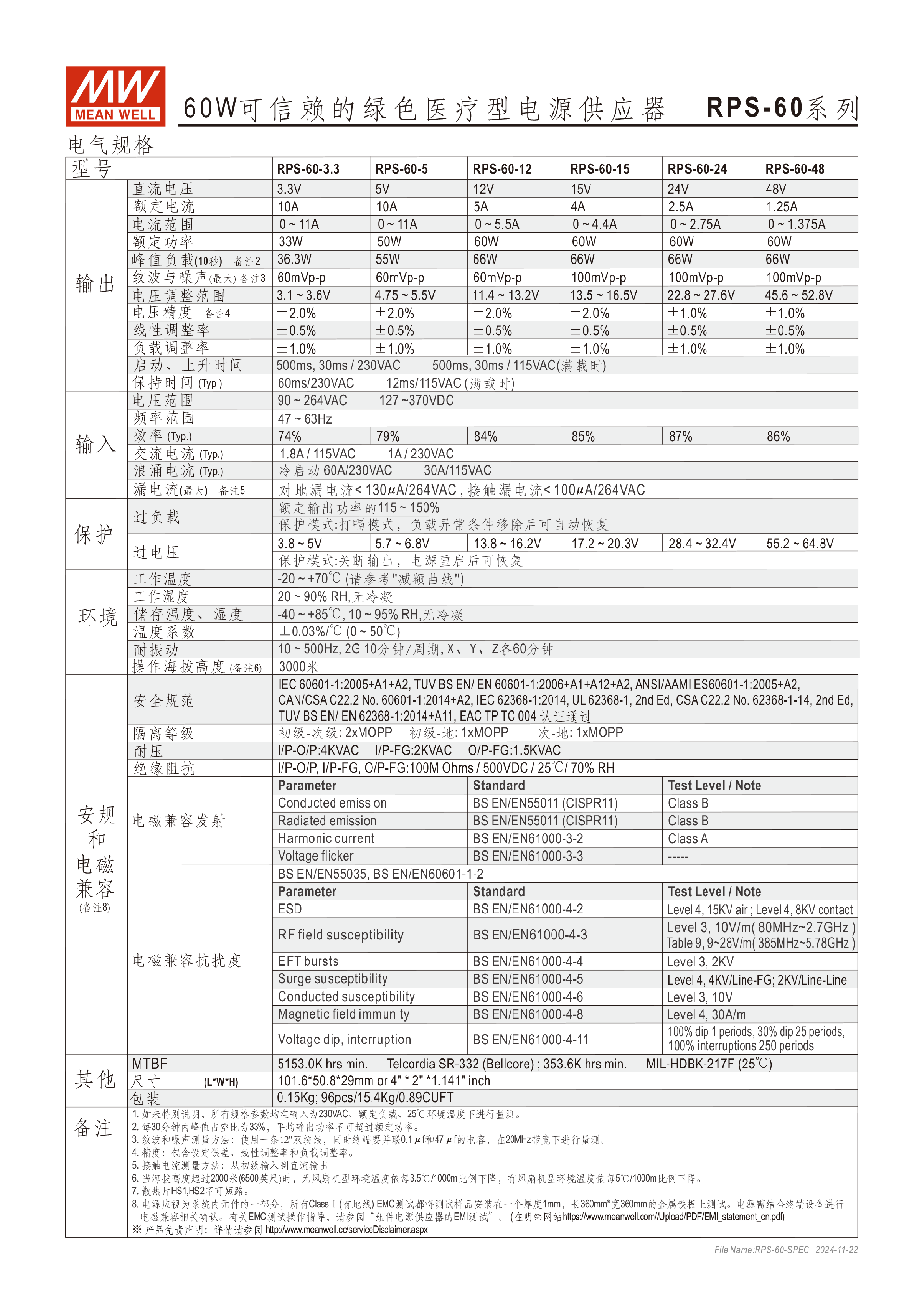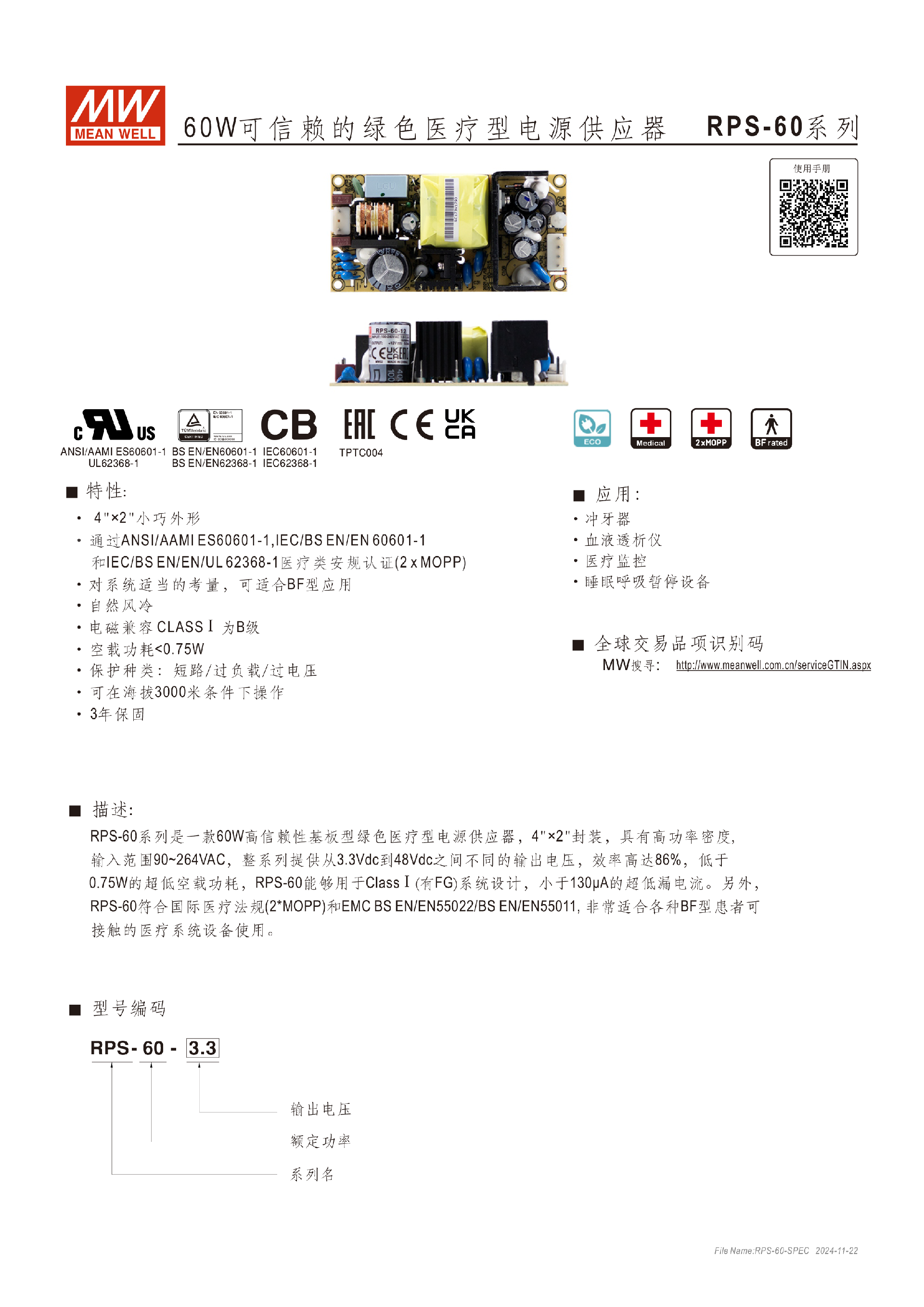 台湾明纬RPS-75系列75W医疗型电源供应器