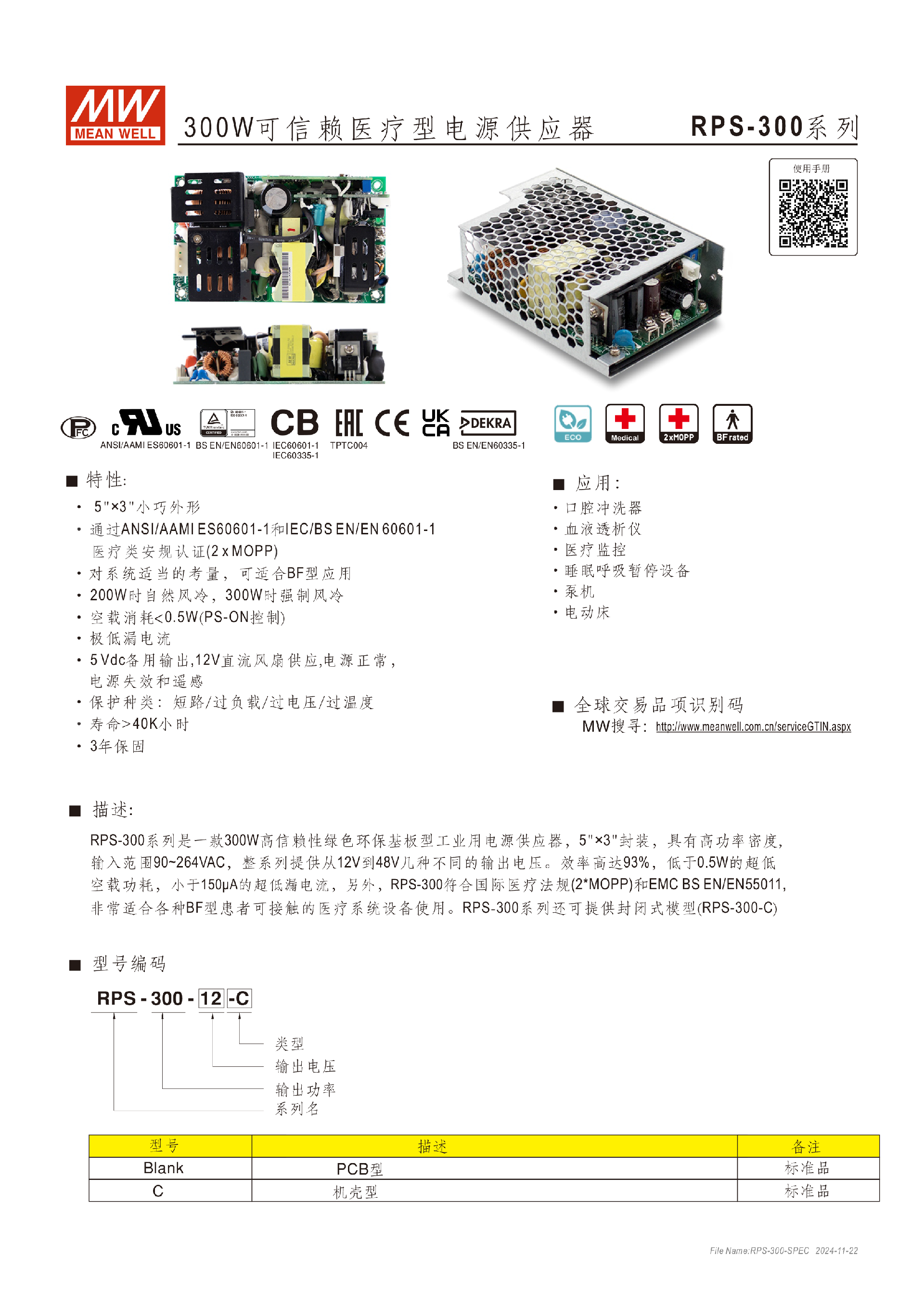 台湾明纬RPS-400系列400W医疗型电源供应器